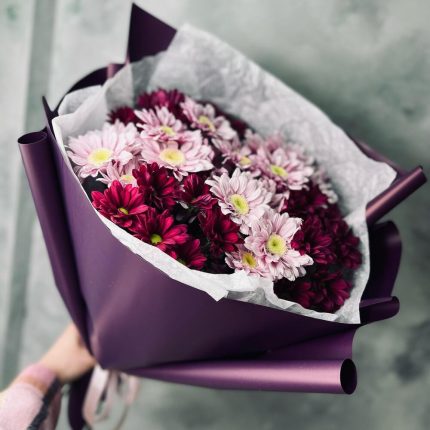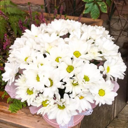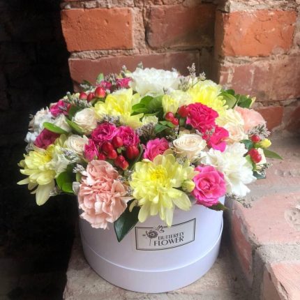 Шляпная коробка с гвоздикой, кустовой розой, гиперикумом, кустовой хризантемой “Фруктовые леденцы”
