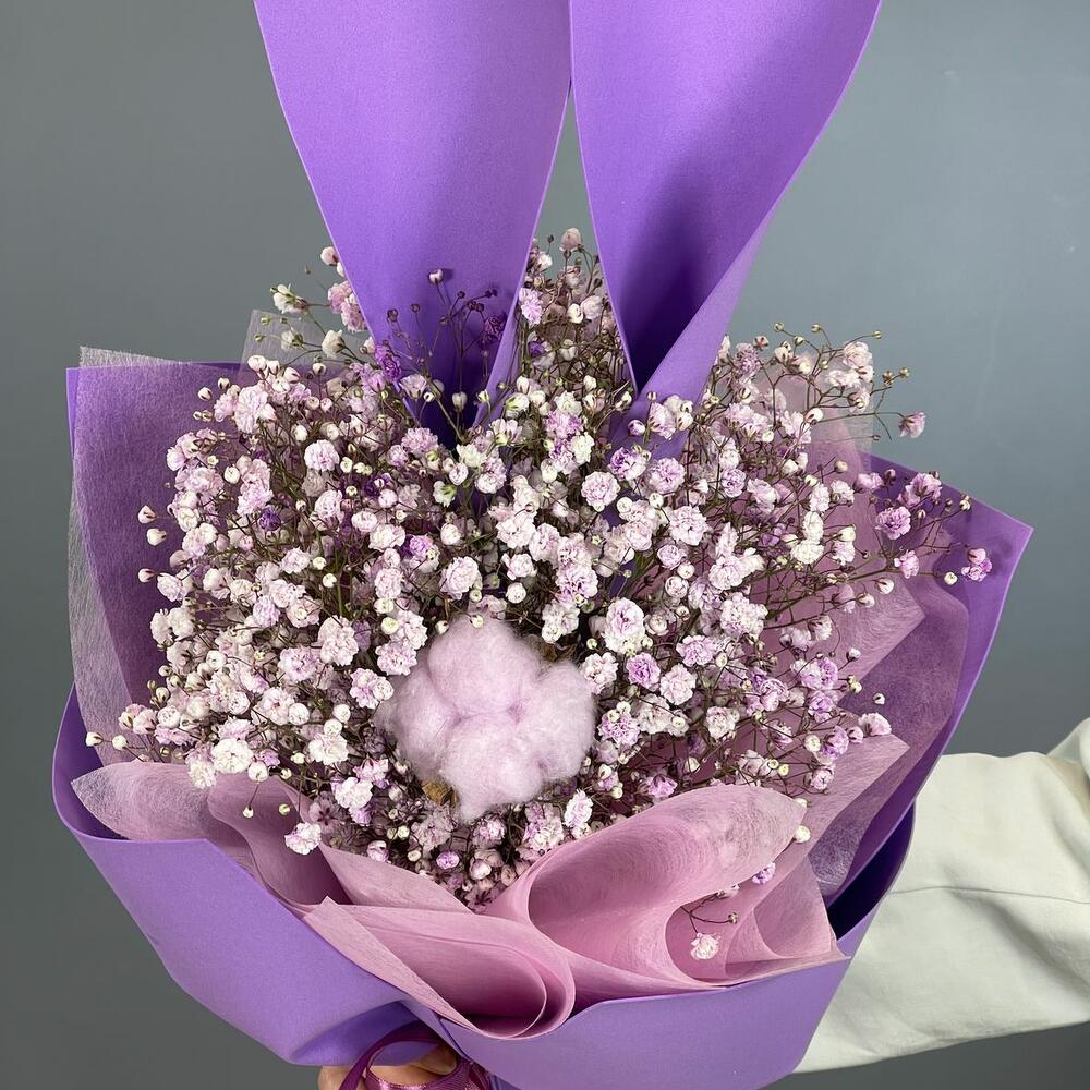 Гипсофила – 3 шт.Хлопок – 1 шт.Лента атласная – 1 шт.Упаковка дизайнерская – 2 шт.