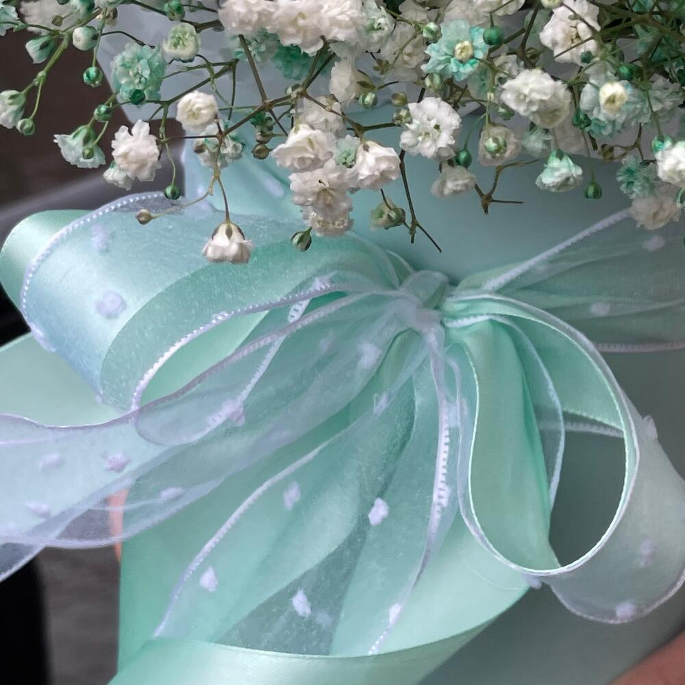 Гипсофила – 6 шт.Тишью – 1 шт.Коробка шляпная – 1 шт.Оазис флористический – 1 шт.Лента атласная – 1 шт.