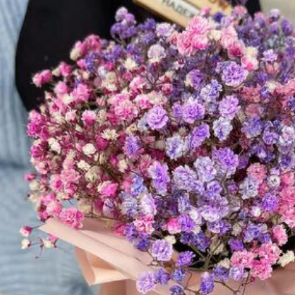 Лента – 1 шт.Пленка – 1 шт.Оазис – 1 шт.Наклейка – 1 шт.гипсофила радужная – 3 шт.коробка 12х12 – 1 шт.
