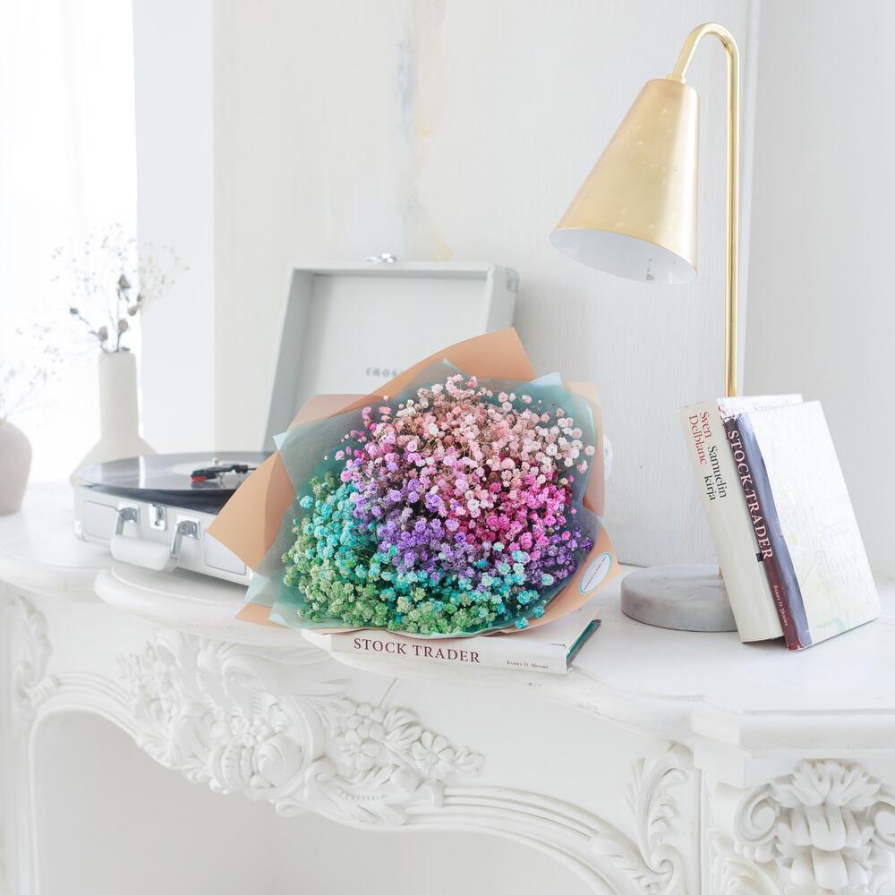 Лента атласная – 1 шт.Упаковка корейская пленка – 2 шт.инструкция по уходу за цветами – 1 шт.упаковка транспортировочная – 1 шт.гипсофила цветная микс – 7 шт.