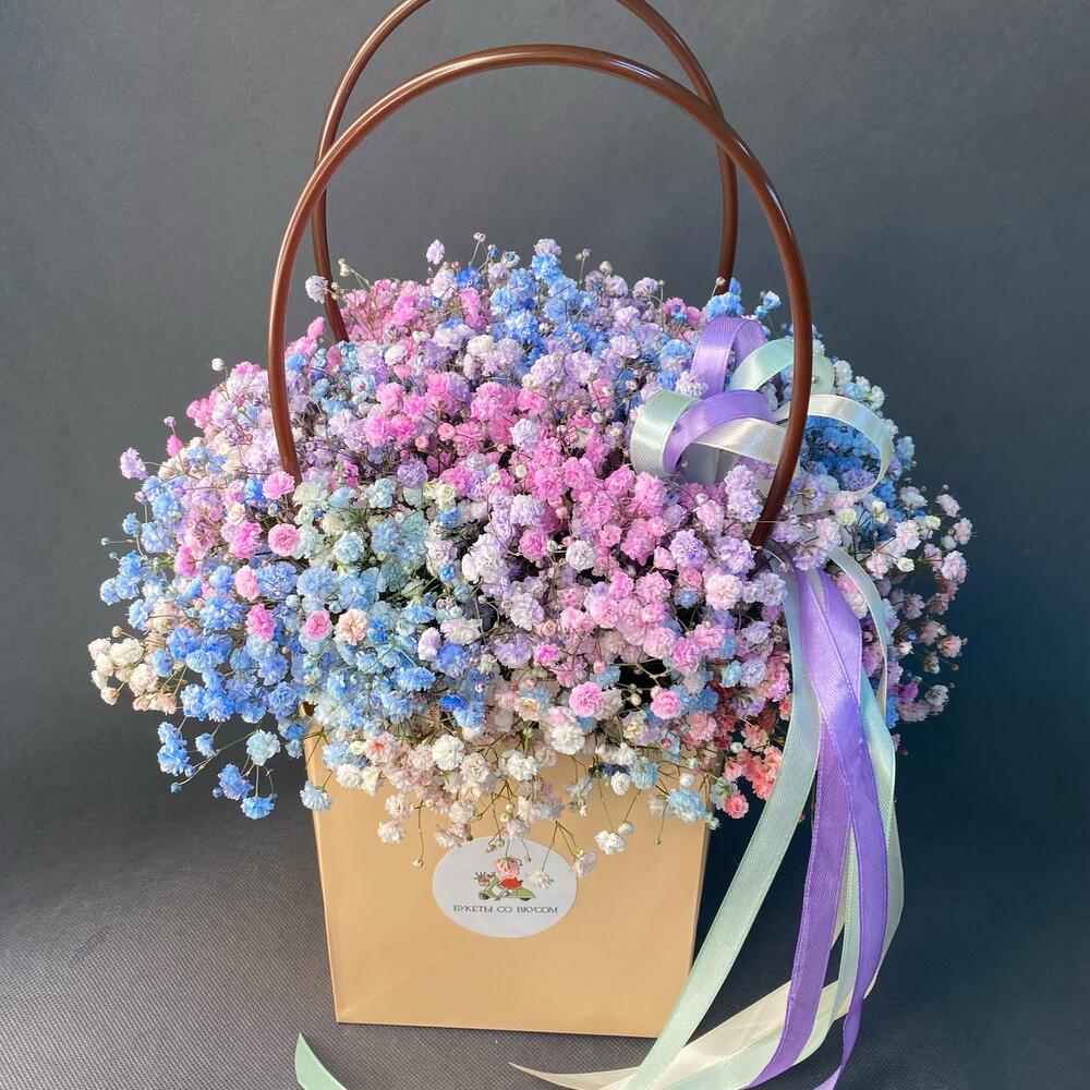 Стильная, сочная композиция из гипсофилы в сумочке станет прекрасным подарком на любой праздник или приятным сюрпризом в качестве комплимента
