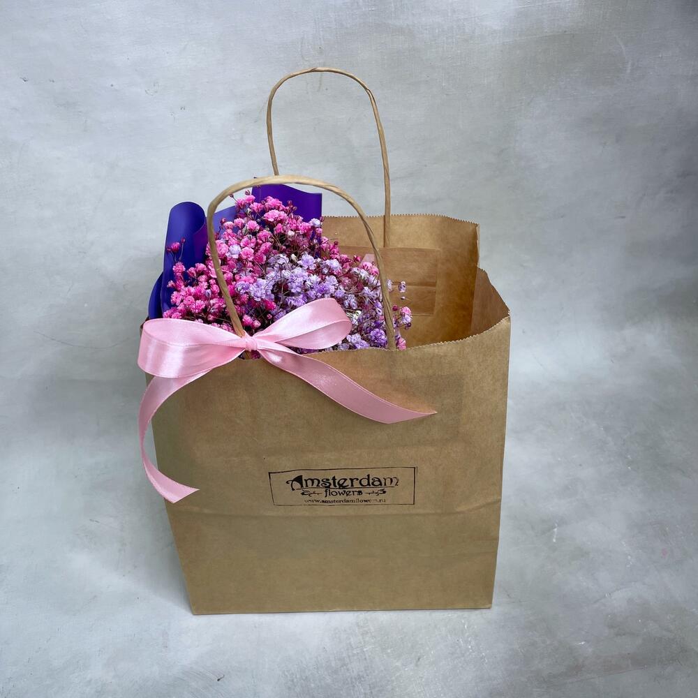 Гипсофила – 3 шт.Упаковка тишью – 1 шт.Упаковка пленка матовая – 1 шт.Лента атласная – 1 шт.raffaello 150 гр – 1 шт.Пакет крафт – 1 шт.