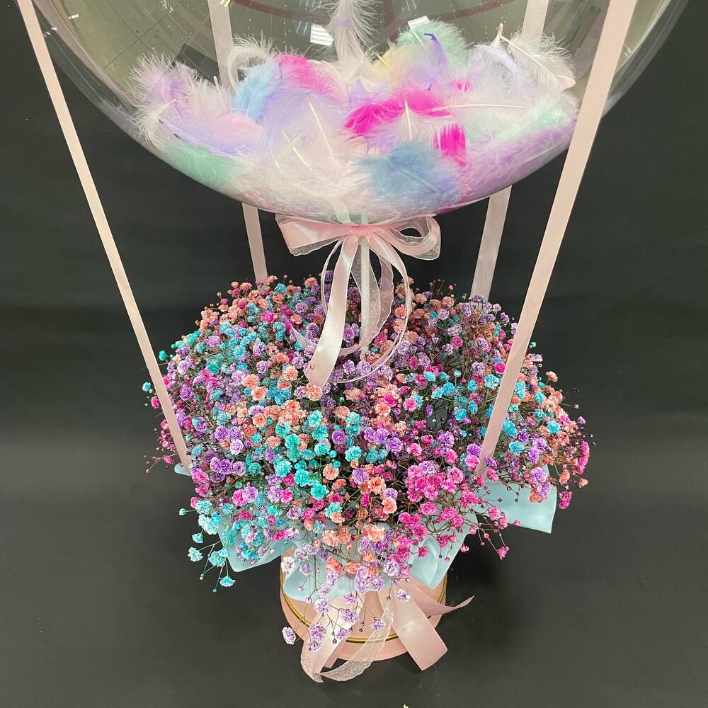 гипсофила радужная – 9 шт.шар баббл с перьями – 1 шт.Лента атласная – 4 шт.Шляпная коробка с лентами – 1 шт.Оазис флористический – 1 шт.