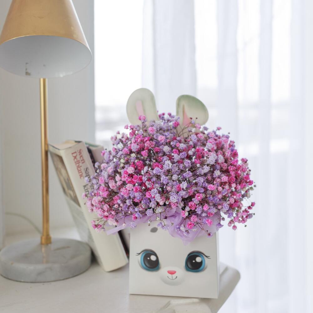 гипсофила цветная – 5 шт.коробка зайка – 1 шт.Тишью – 4 шт.Оазис флористический – 1 шт.упаковка транспортировочная – 1 шт.инструкция по уходу за цветами – 1 шт.