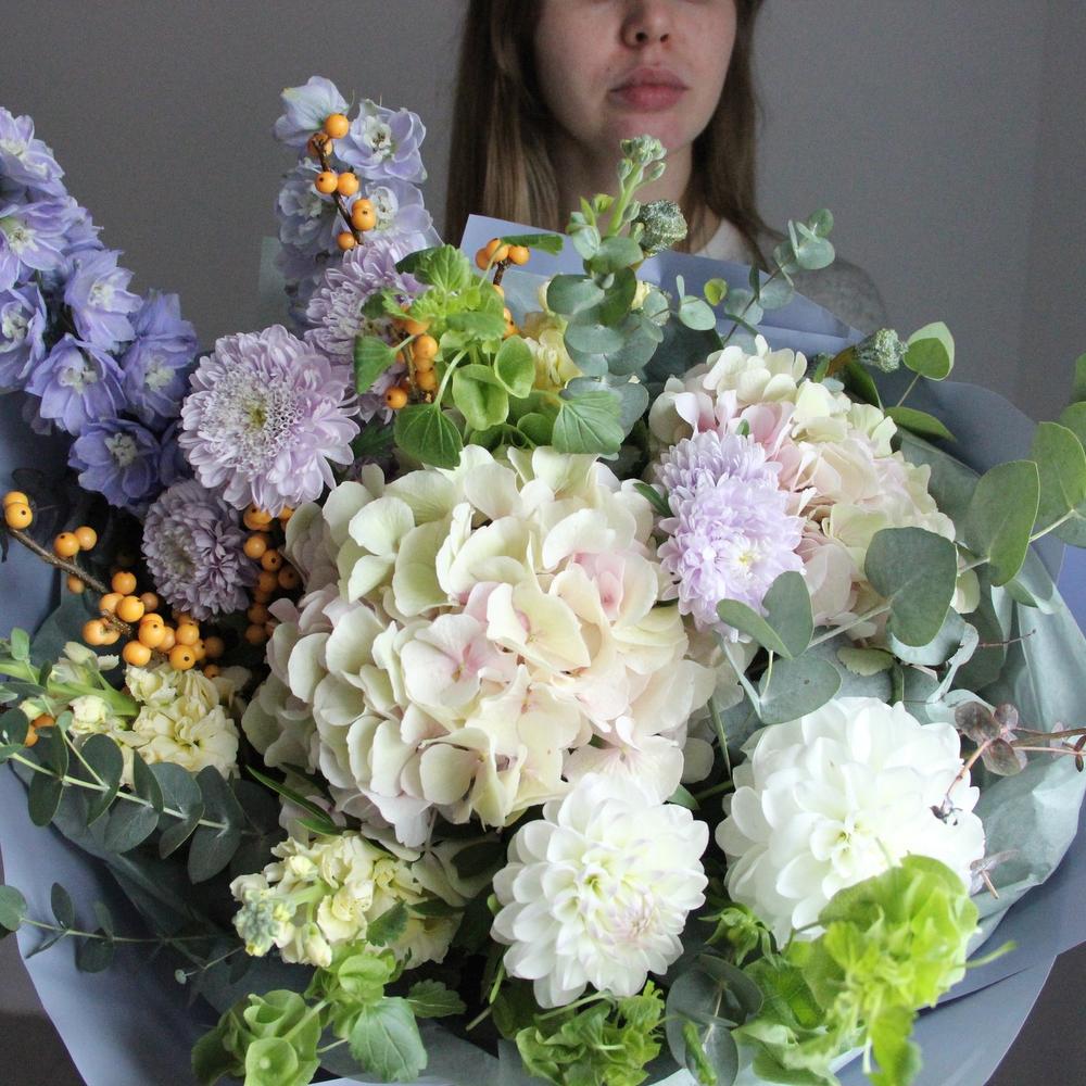 Дельфиниум – 2 шт.Гортензия – 2 шт.Илекс – 2 шт.Астра – 3 шт.Маттиола – 3 шт.Георгина – 3 шт.ирландский колокольчик – 3 шт.Эвкалипт – 5 шт.Тишью – 2 шт.Упаковка – 2 шт.Лента атласная – 1 шт.