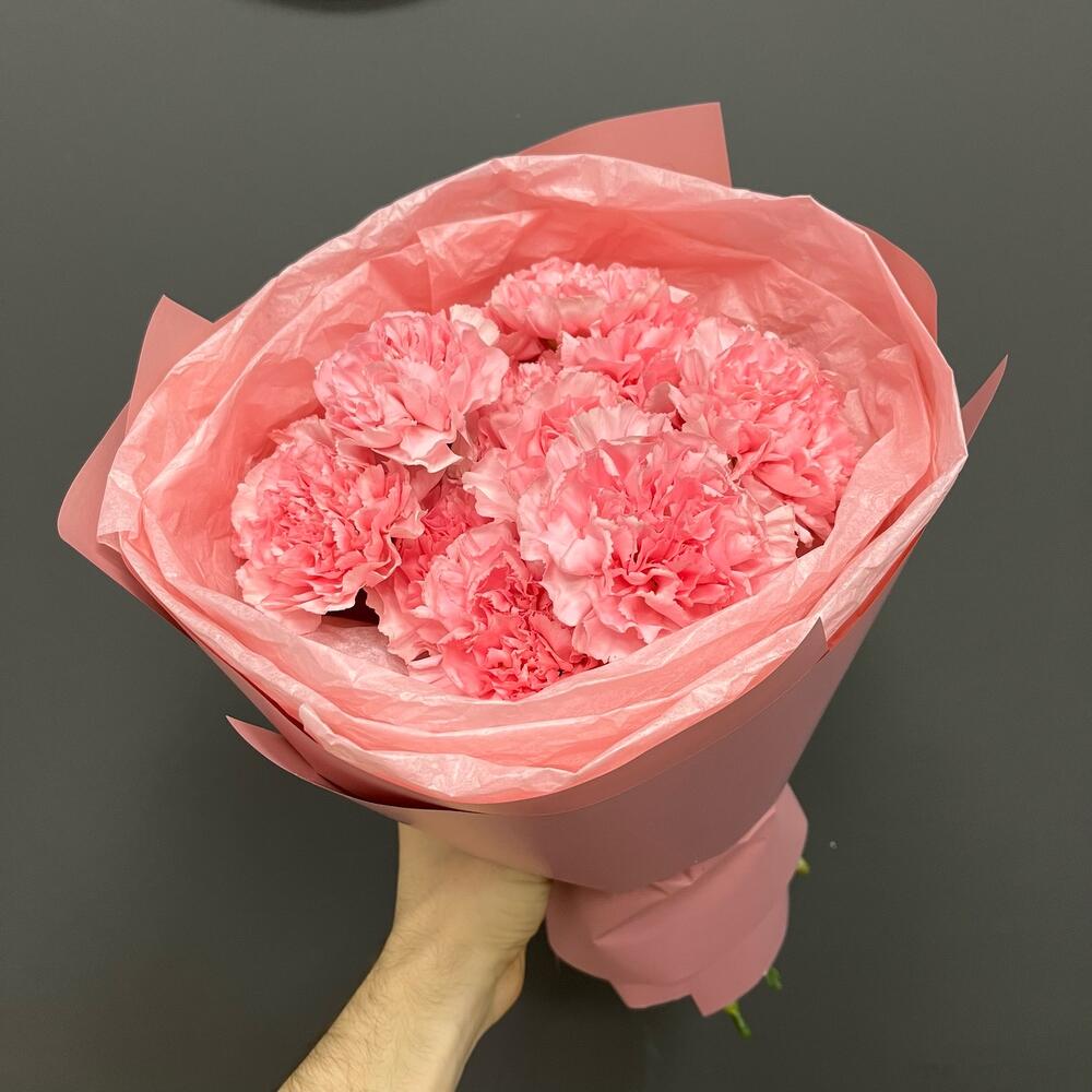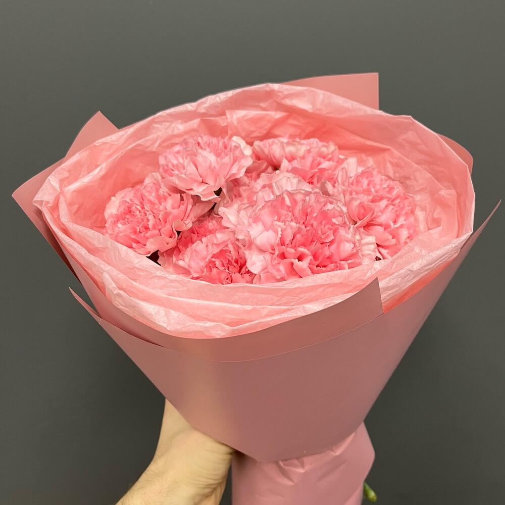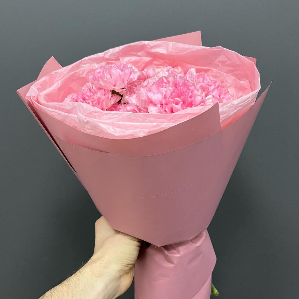 Лента атласная – 1 шт.Упаковка корейская пленка – 1 шт.диантус одноголовый розовый – 13 шт.тишью нежно-розовое – 1 шт.