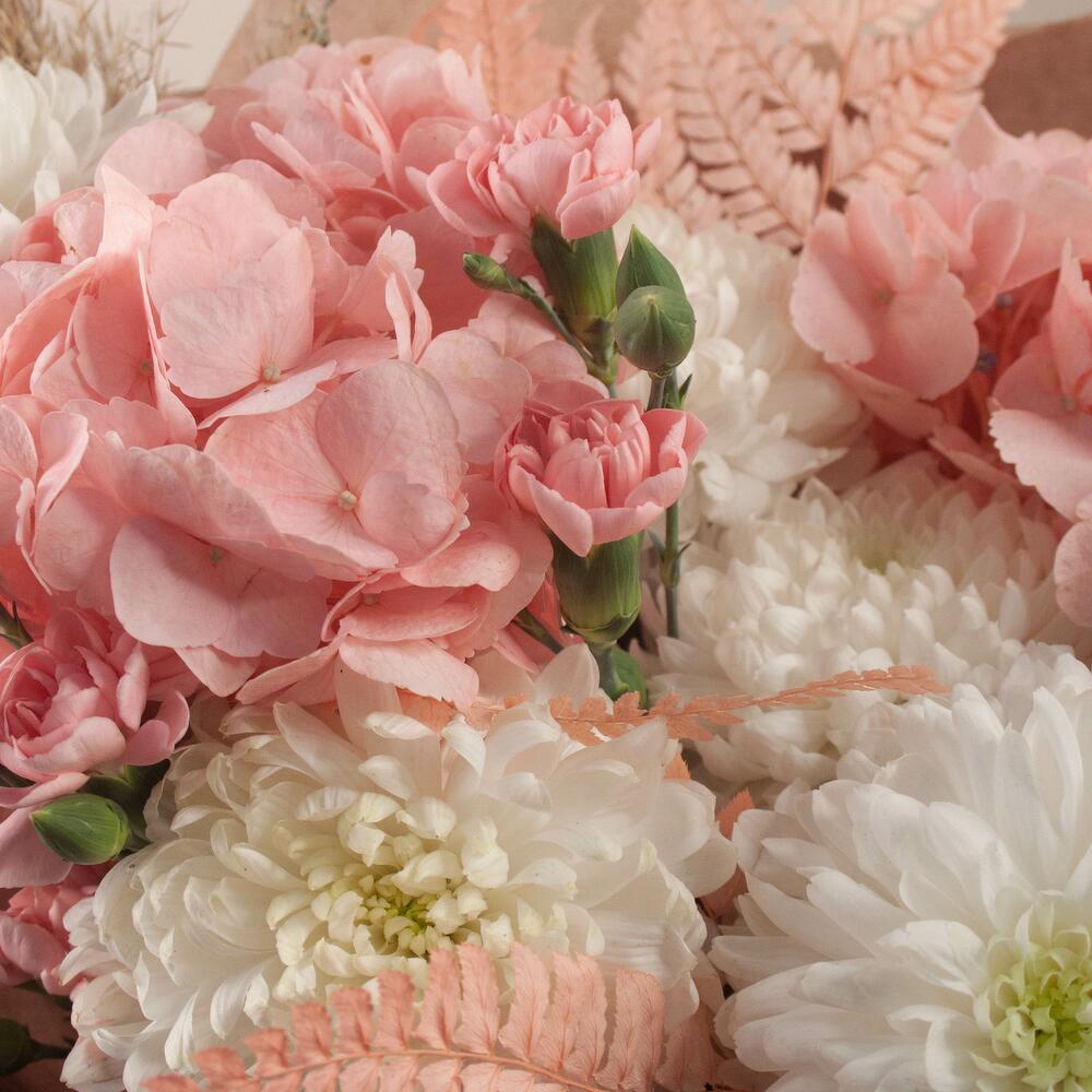 Гвоздика – 5 шт. Гортензия – 2 шт. лист папоротника – 2 шт. Хризантема одноголовая – 6 шт. Оформление – 1 шт.