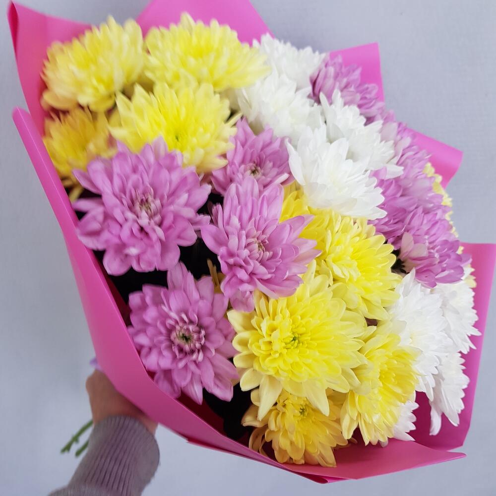 Хризантема кустовая – 9 шт.Лента атласная – 1 шт.Дизайнерская упаковка – 1 шт.