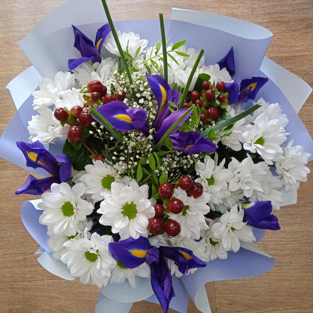 Ирис Blue Magic – 6 шт.Хризантема кустовая – 5 шт.Гиперикум красный КУСТОВОЙ – 3 шт.Гипсофила – 1 шт.Фисташка пучок – 1 шт.Упаковка дизайнерская – 1 шт.Лента – 1 шт.