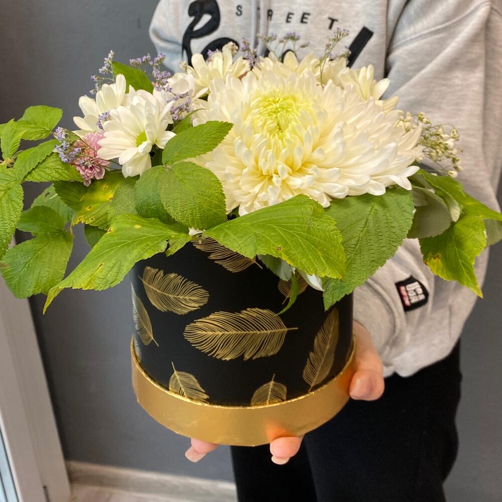 магнум – 1 шт.Хризантема кустовая – 3 шт.Малина – 3 шт.Лимониум – 1 шт.Коробка шляпная – 1 шт.Оазис флористический – 1 шт.