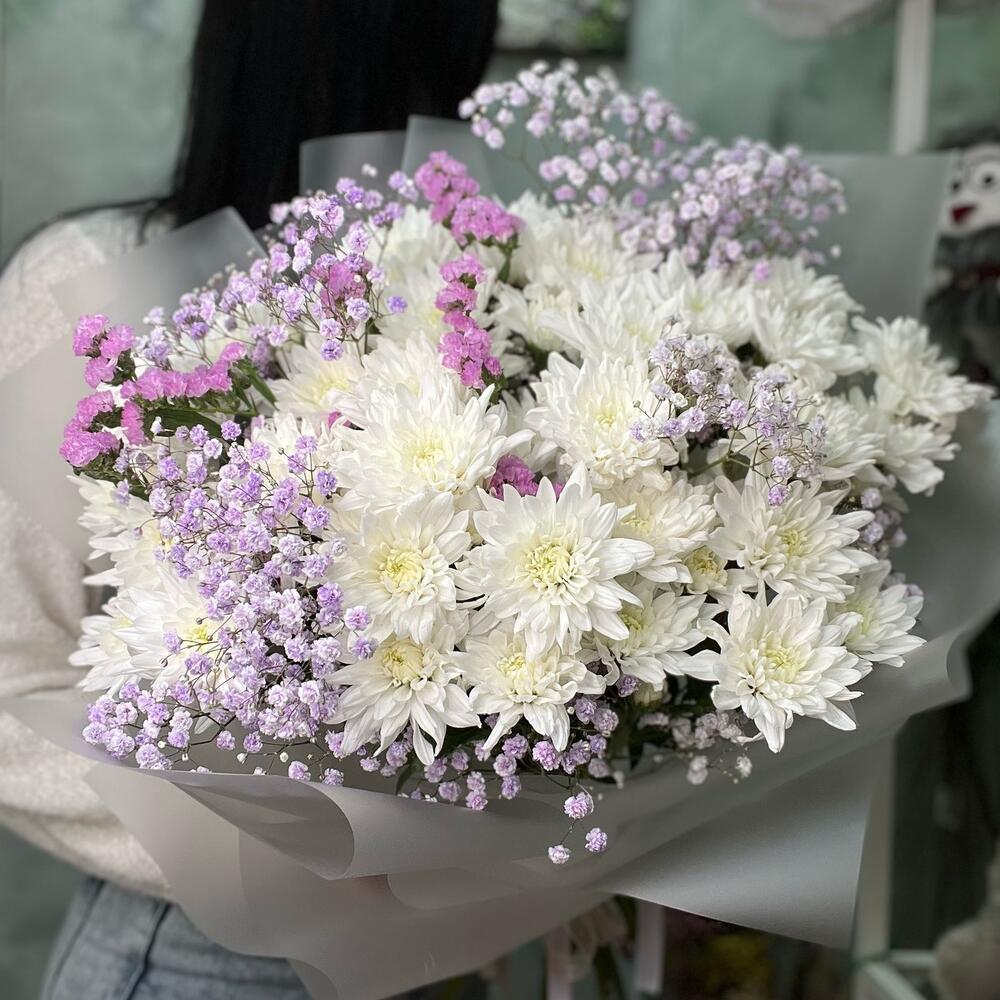 Хризантема кустовая – 9 шт.Статица – 1 шт.гипсофила радужная – 3 шт.Упаковка дизайнерская – 2 шт.Лента атласная – 2 шт.