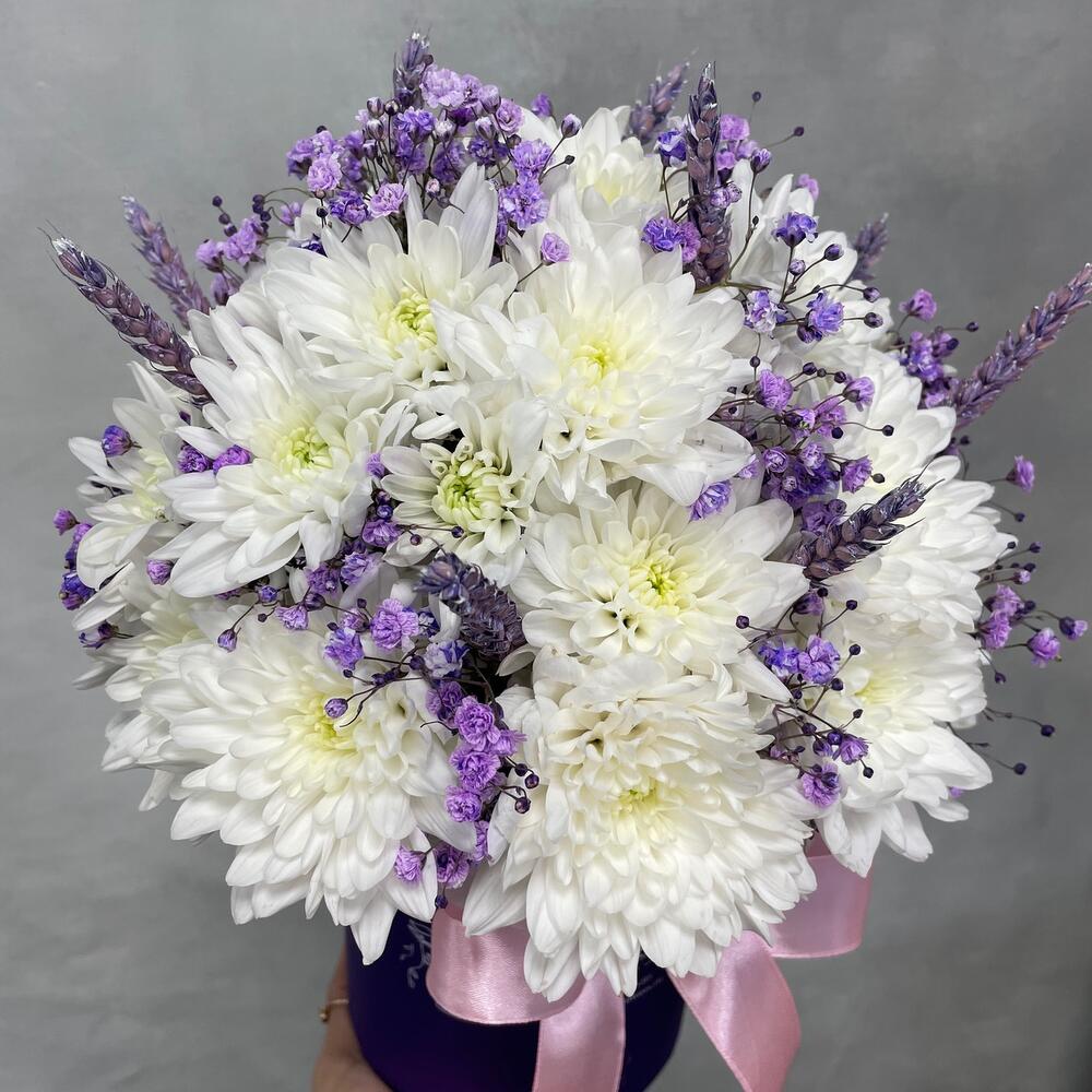 Коробка d12 – 1 шт.Оазис – 1 шт.Хризантема кустовая – 5 шт.Гипсофила фиолетовая – 2 шт.Пшеница (сухоцвет) – 9 шт.