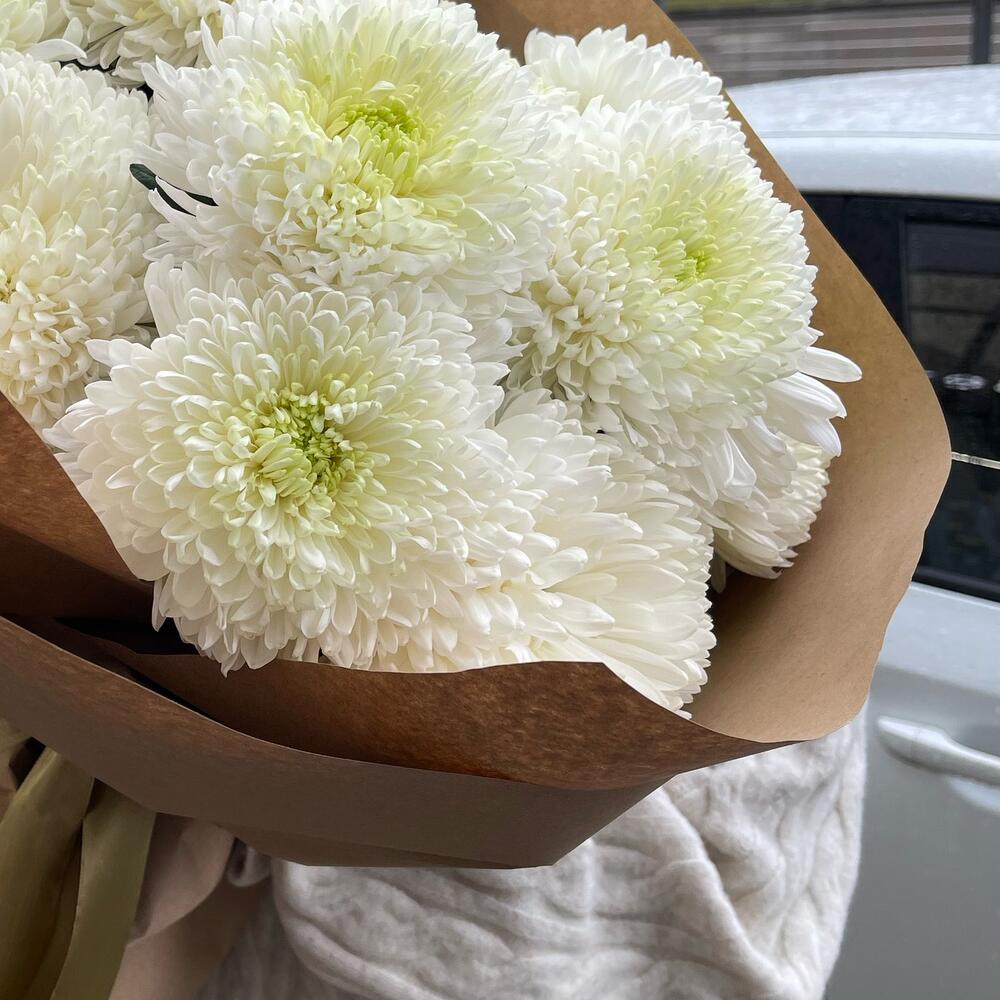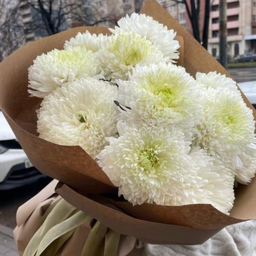 Хризантема – 15 шт.Лента атласная – 3 шт.Крафт дизайнерский – 4 шт.