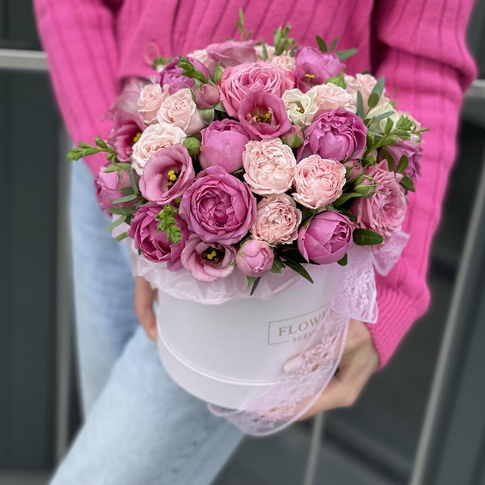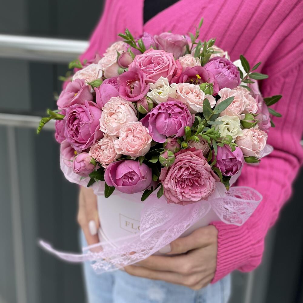Коробка Валенсия с кустовыми пионовидными розами и эустомой