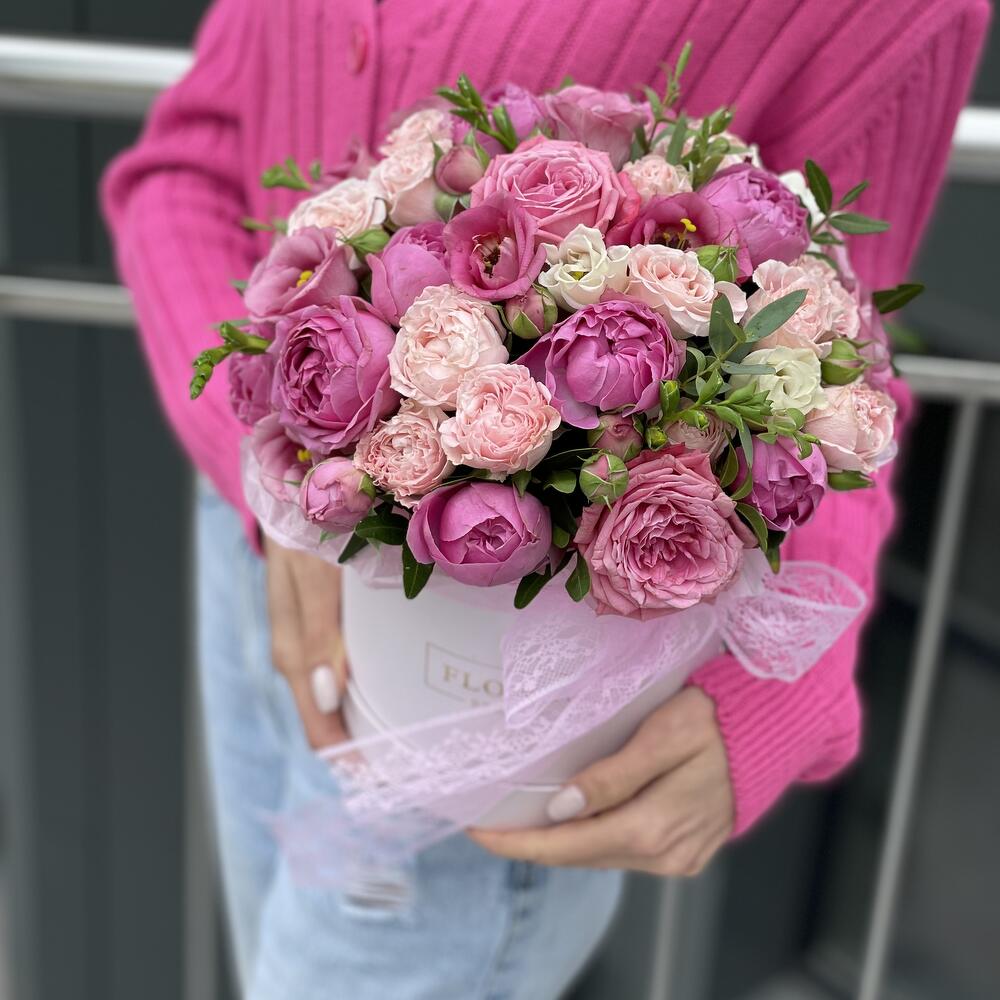 Коробка Трогательные чувства из эустомы и пионовидных роз