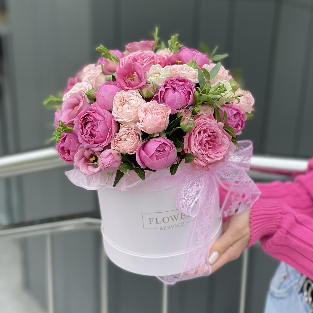 Коробка из кустовых роз, эустомы и зелени !