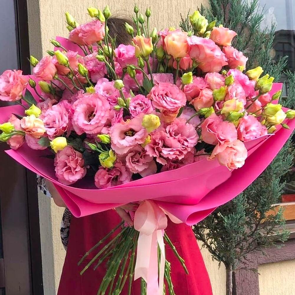 Стильная упаковка – 2 шт.работа флориста – 1 шт.эустома розовая лизиантус – 15 шт.