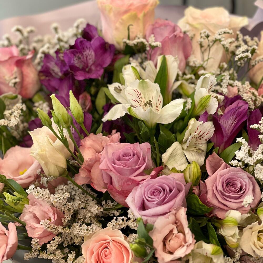 Нежный букет из розы, альстромерии, эустомы в стильной упаковке