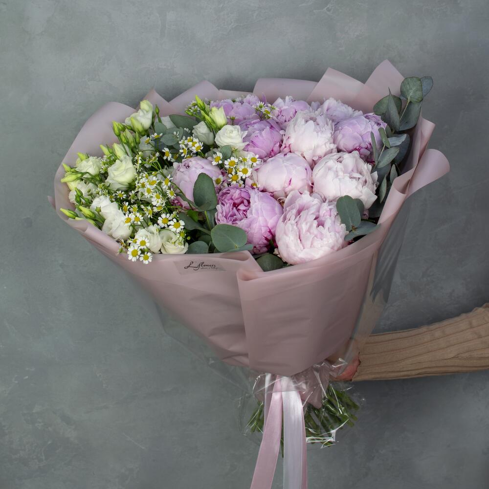 Летний микс с розовыми пионами, лизиантусами и ромашкой.