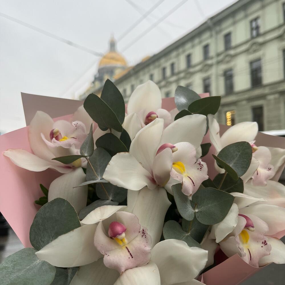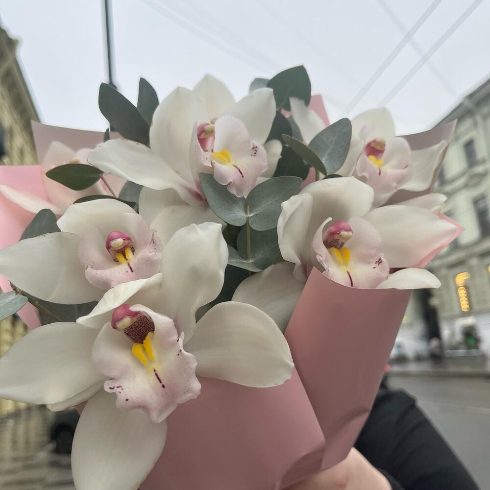 Лента атласная – 2 шт.удлинитель для орхидеи – 7 шт.Упаковка корейская пленка – 1 шт.премиум орхидея цимбидиум – 7 шт.