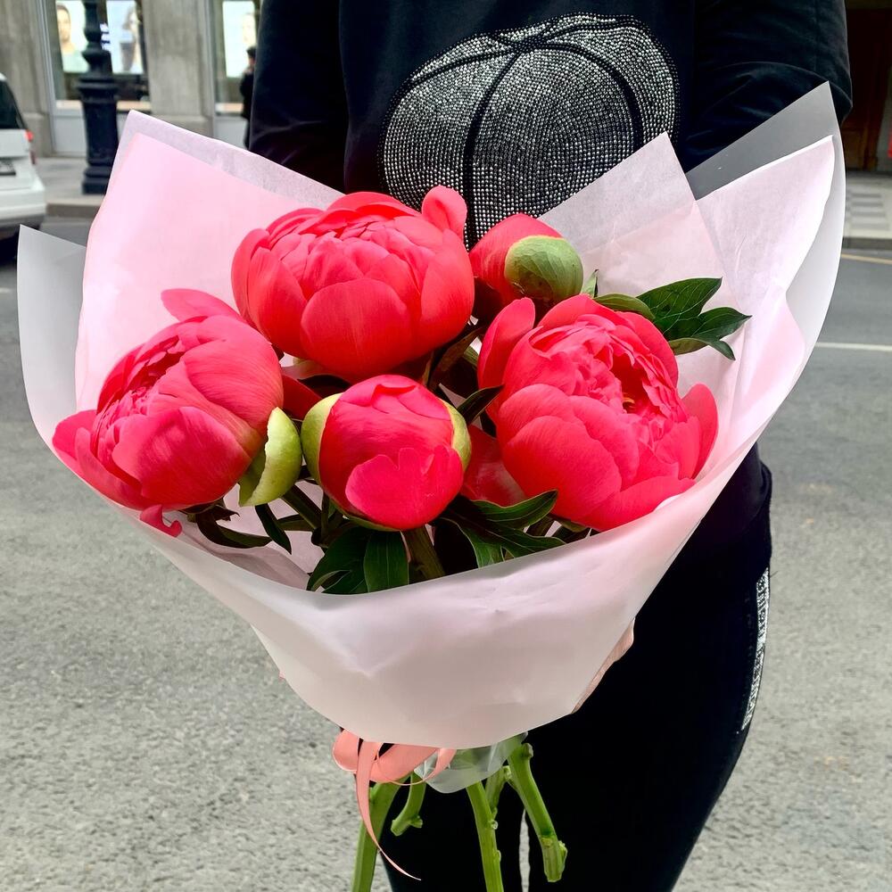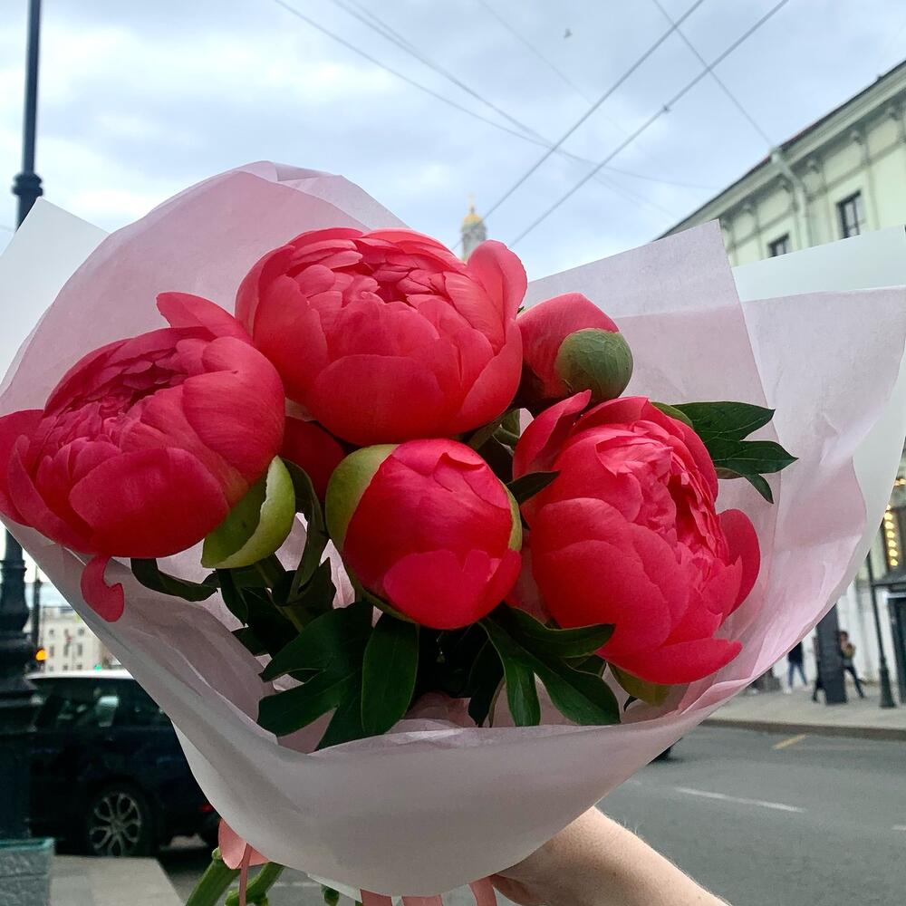 Лента – 2 шт.Пион – 5 шт.Упаковка дизайнерская – 2 шт.