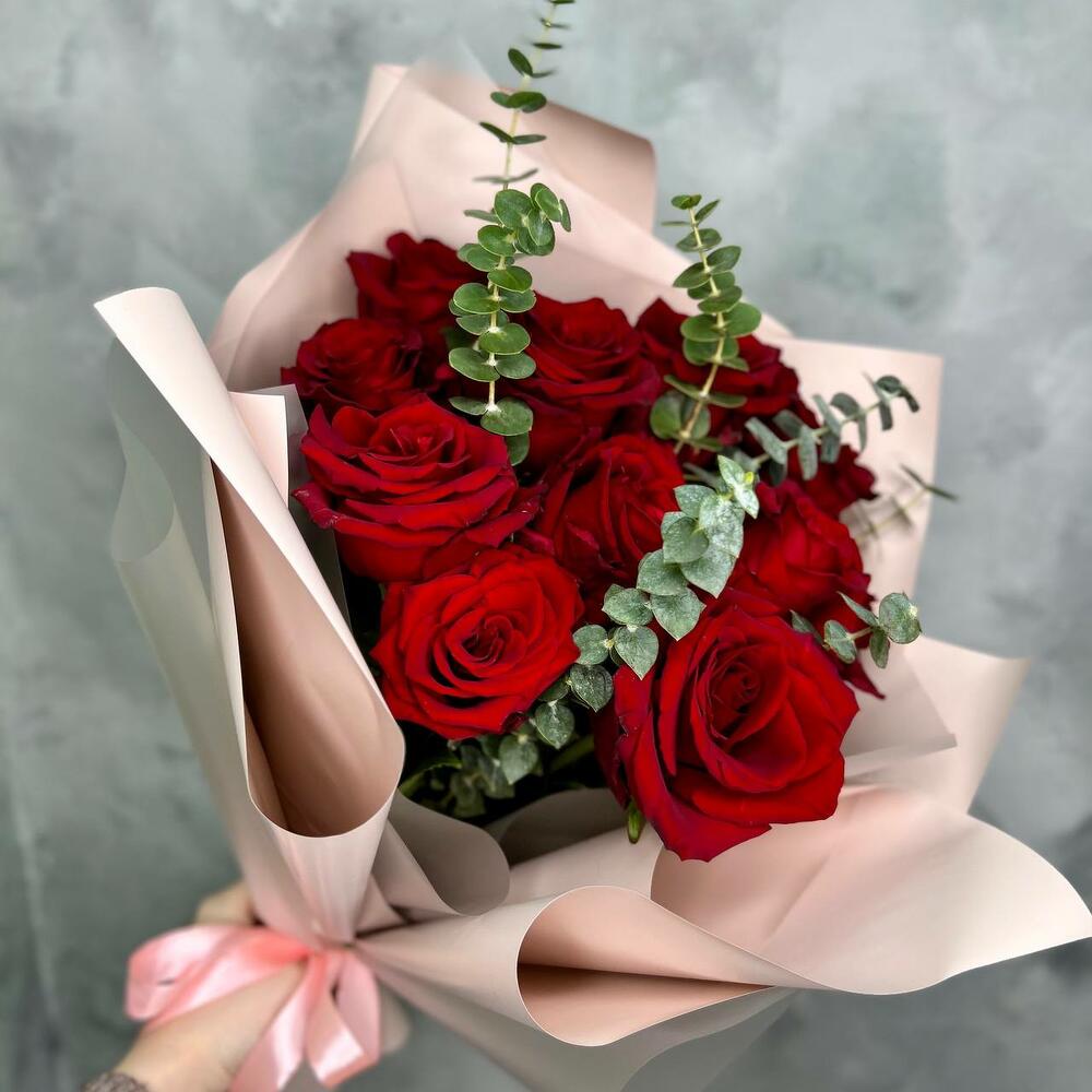 Эвкалипт – 3 шт.Лента атласная – 1 шт.Роза Эксплорер – 11 шт.Упаковка дизайнерская – 2 шт.