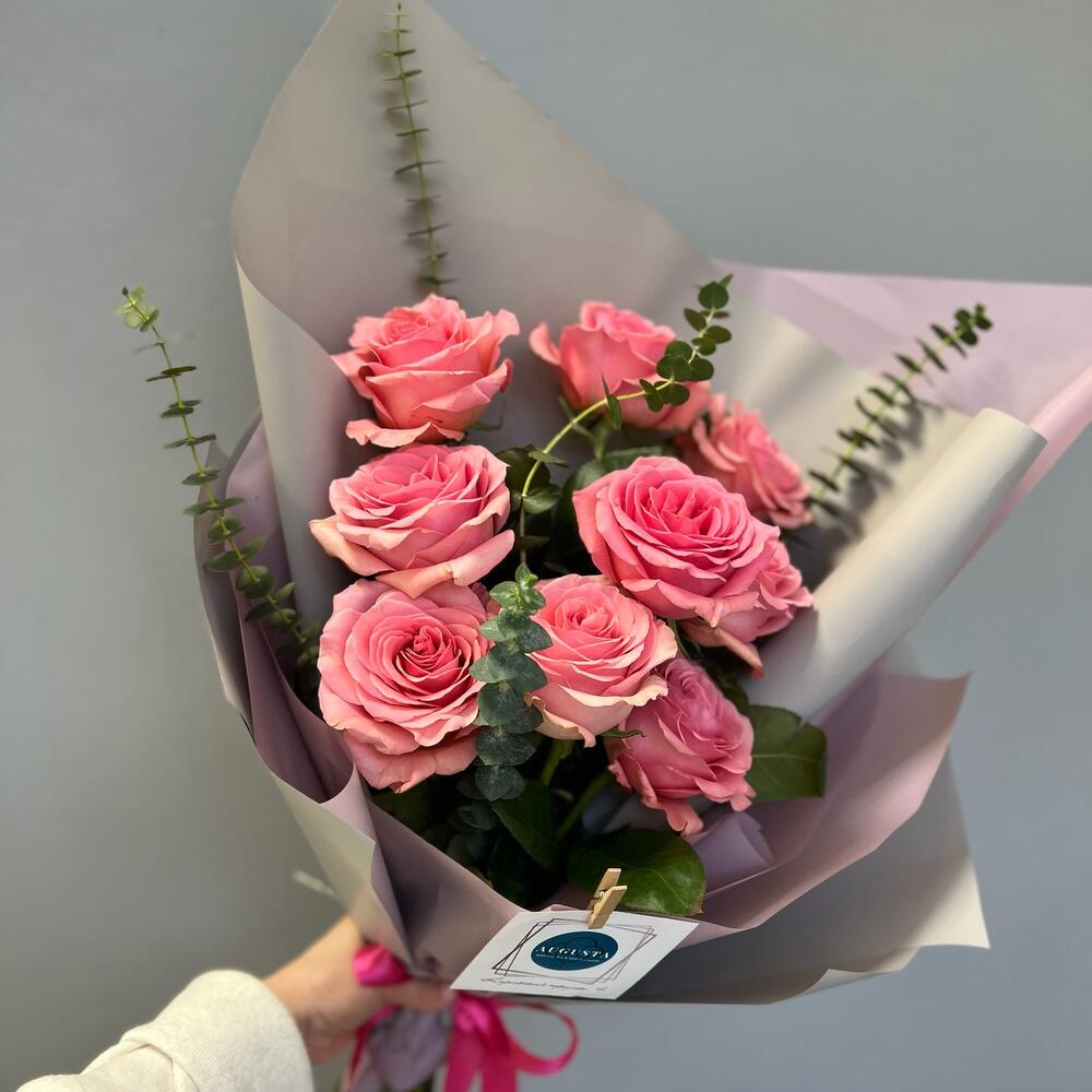 9 нежно-розовых роз и эвкалипт