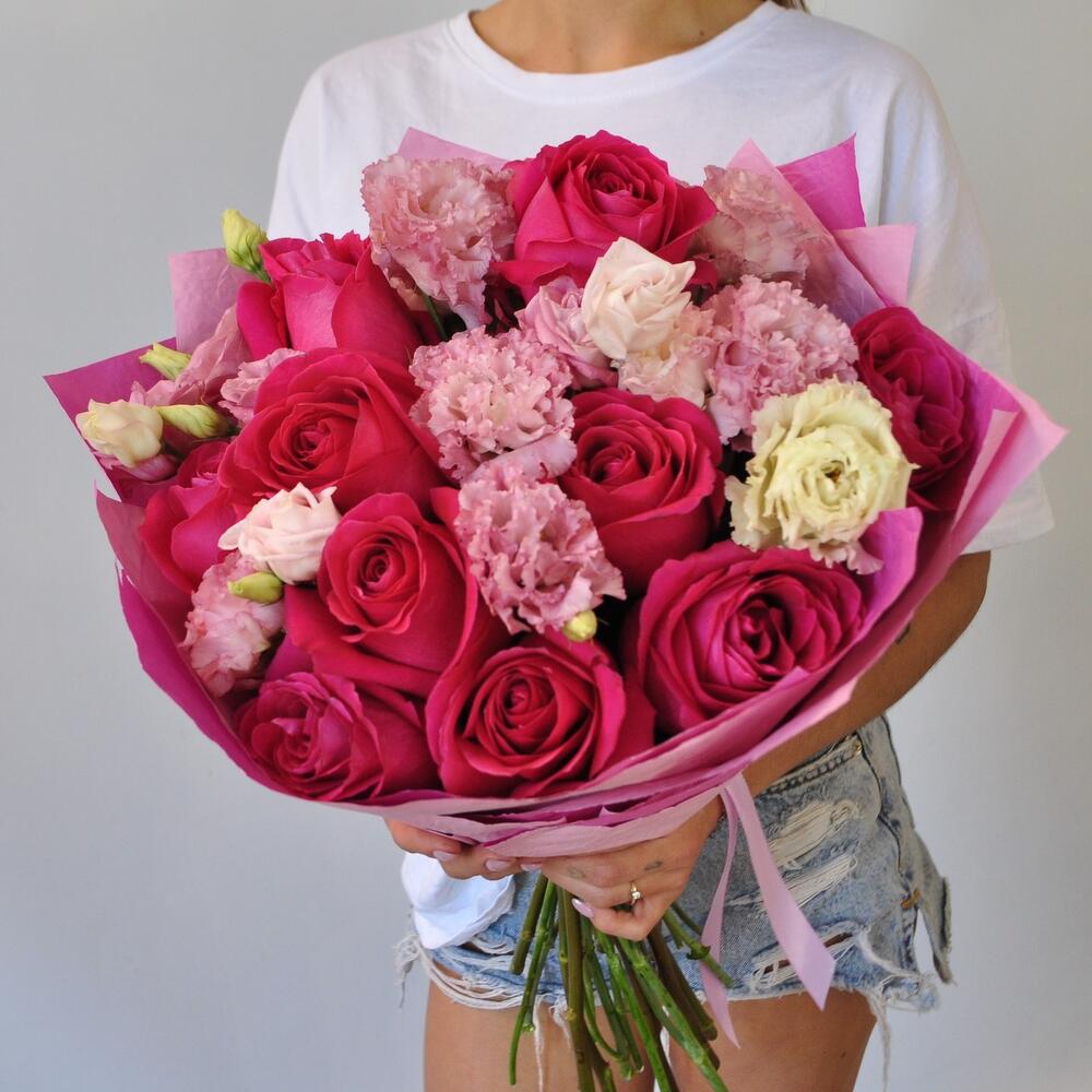 Лента атласная – 1 шт.эустома розовая махровая – 5 шт.роза Pink Floyd ароматная – 11 шт.упаковка жатая крафт бумага – 1 шт.