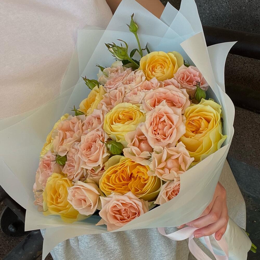Лента – 1 шт.Роза кустовая – 8 шт.Упаковка дизайнерская – 1 шт.роза батеркап – 7 шт.