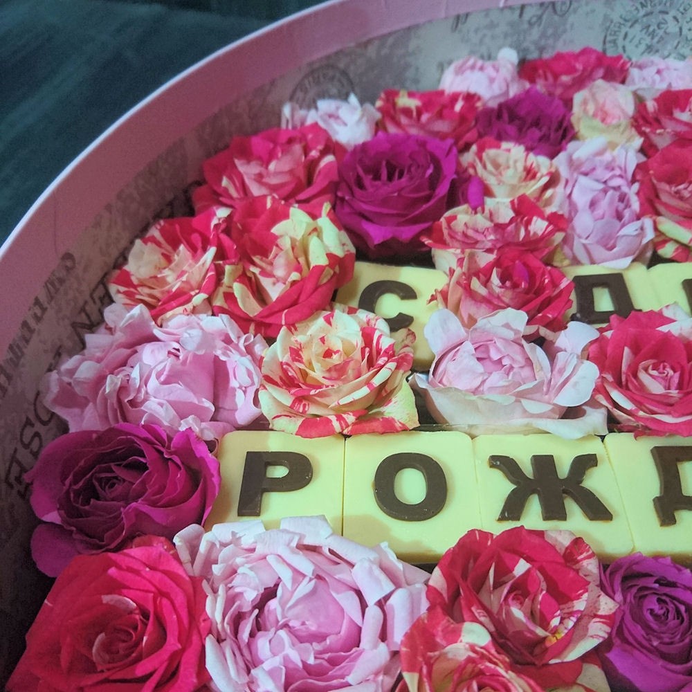 Коробка шляпная – 1 шт.Роза кустовая розовая – 25 шт.Шоколадные буквы – 17 шт.Макарон – 6 шт.Оазис флористический – 2 шт.