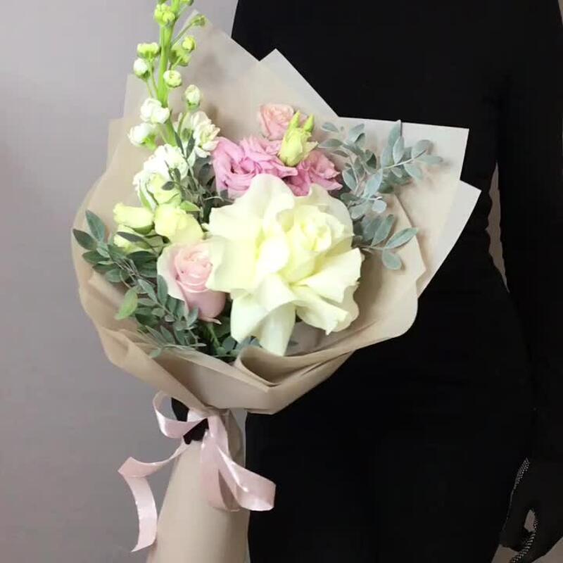Маттиола – 1 шт.Кустовая роза – 1 шт.Роза Эквадор – 1 шт.Эустома – 1 шт.Лента атласная – 1 шт.Фисташка – 2 шт.Французская роза – 1 шт.Пленка матовая – 1 шт.подкормка для срезанных цветов – 1 шт.