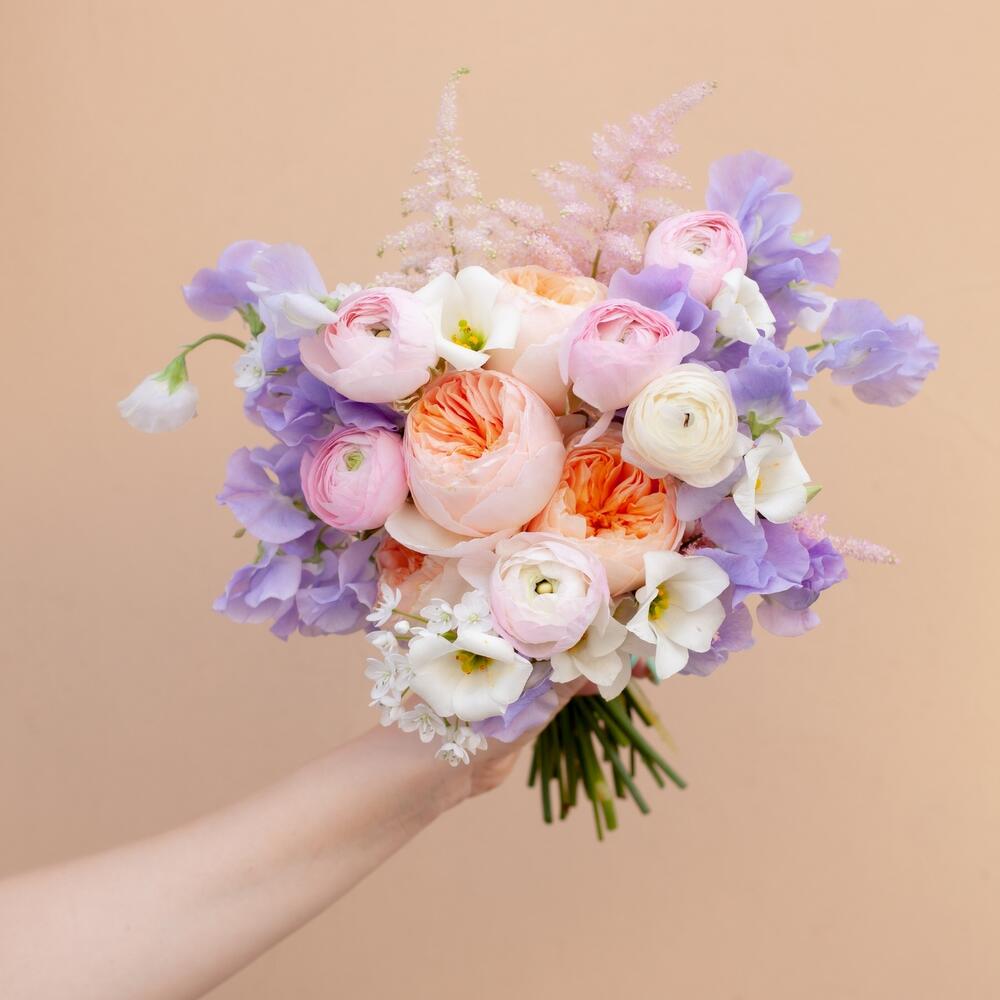 Латирус – 10 шт.Роза Джульетта – 5 шт.Астильба – 3 шт.Ранункулюс розовый – 6 шт.сумка переноска – 1 шт.Ваза – 1 шт.Лизиантус – 1 шт.