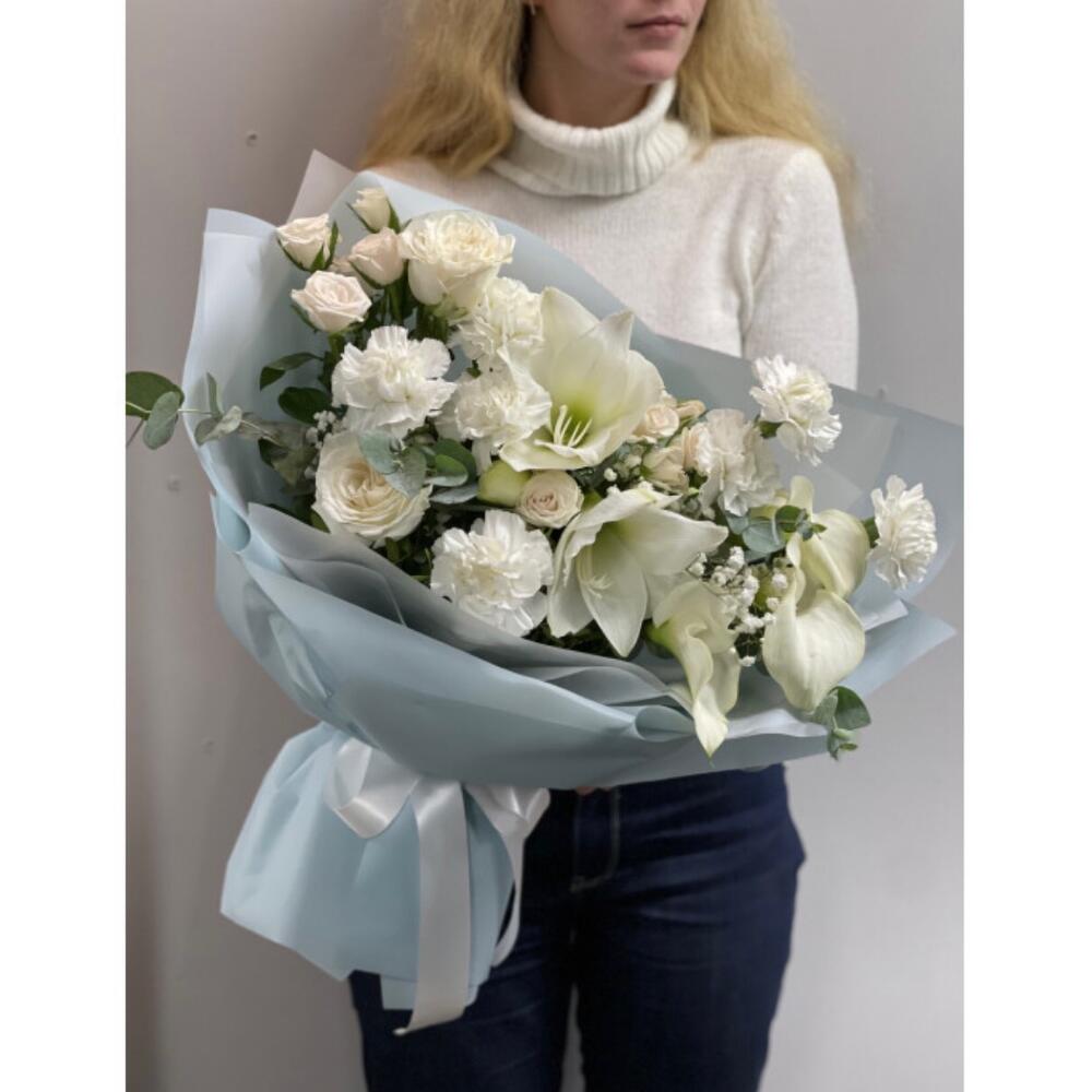 Альстромерии, Гвоздики, Кустовые розы, Лизиантусы, Розы, Хризантемы