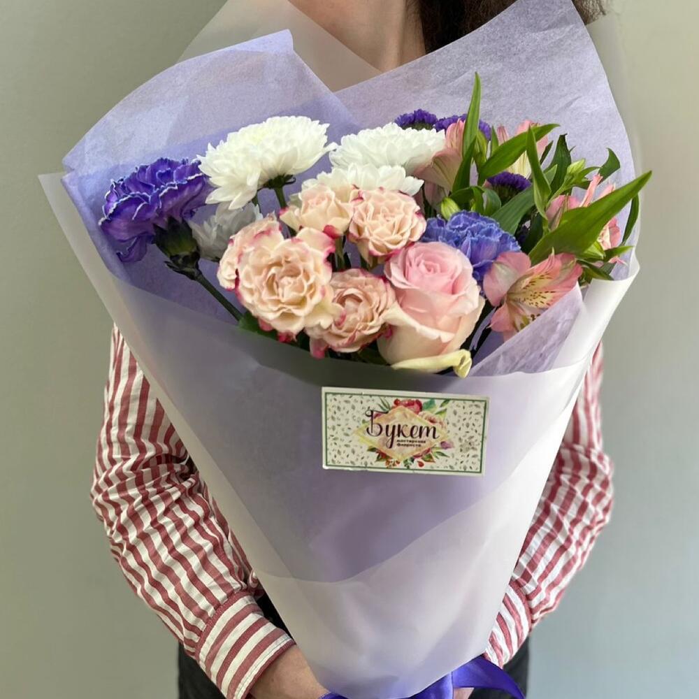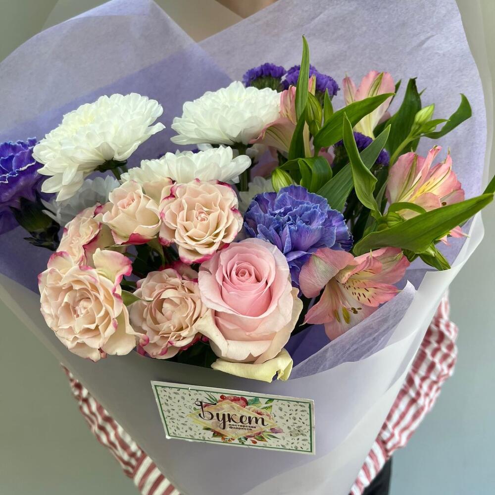 Альстромерия – 1 шт.Роза кустовая – 1 шт.Статица – 1 шт.Хризантема кустовая – 1 шт.Роза Эквадор – 1 шт.Лента атласная – 1 шт.Тишью – 1 шт.Диантус одноголовый – 2 шт.Пленка дизайнерская – 1 шт.