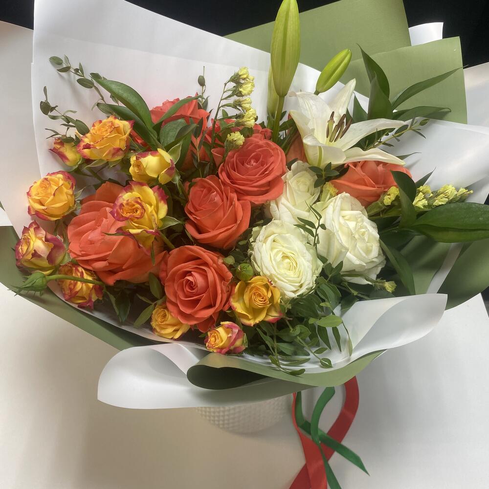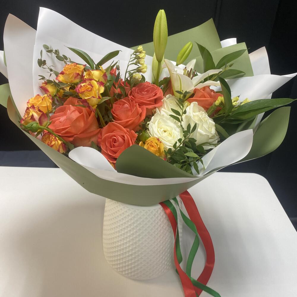 Роза Вау – 8 шт.Роза Аваланж – 3 шт.Роза кустовая – 1 шт.Статица желтая – 2 шт.зелень фисташи – 2 шт.Рускус – 3 шт.Пленка корейская – 2 шт.Лента атласная – 2 шт.Лилия – 1 шт.