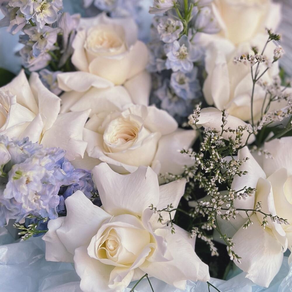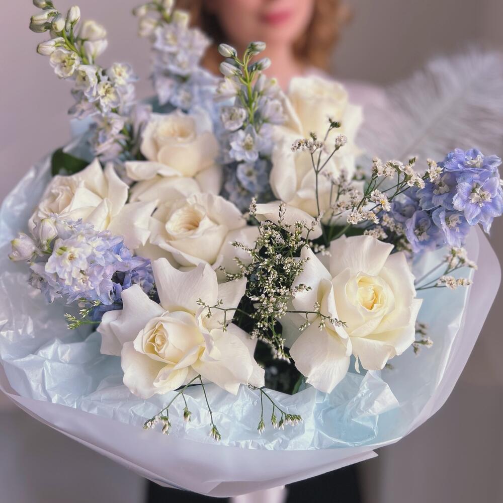 Дельфиниум – 5 шт.Лимониум – 3 шт.Упаковка дизайнерская – 1 шт.Французская роза – 7 шт.перо декоративное – 1 шт.