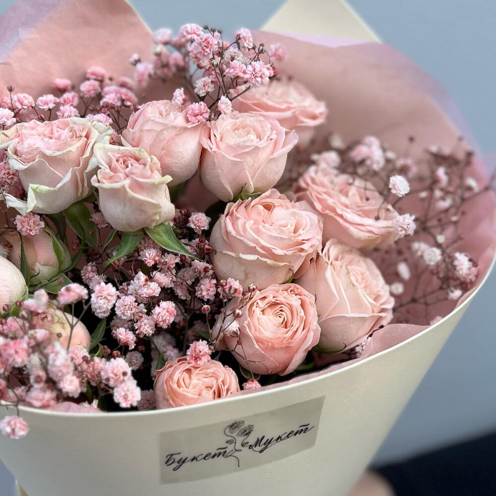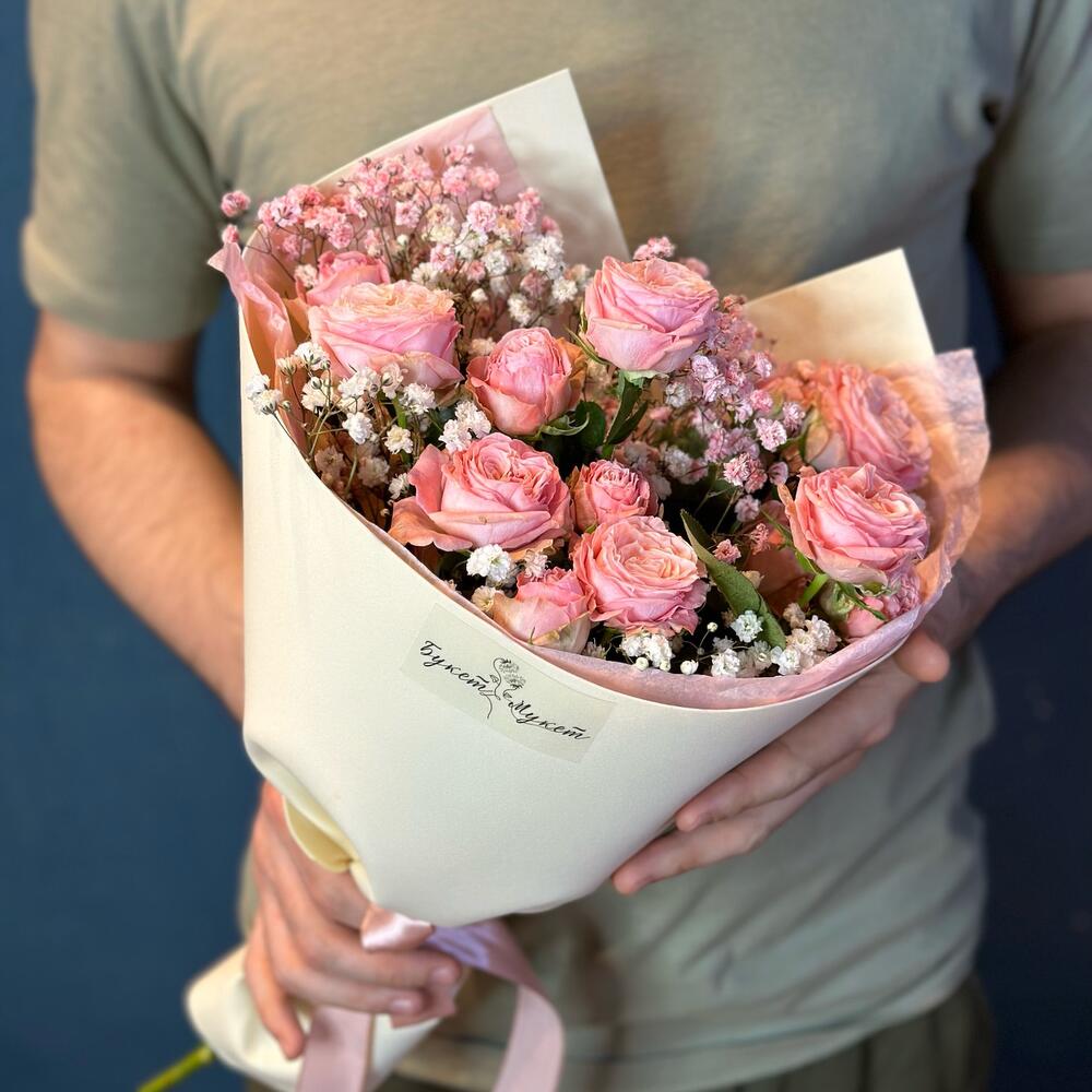 Букет «Ванильное мороженое» (кустовая роза и гипсофила)