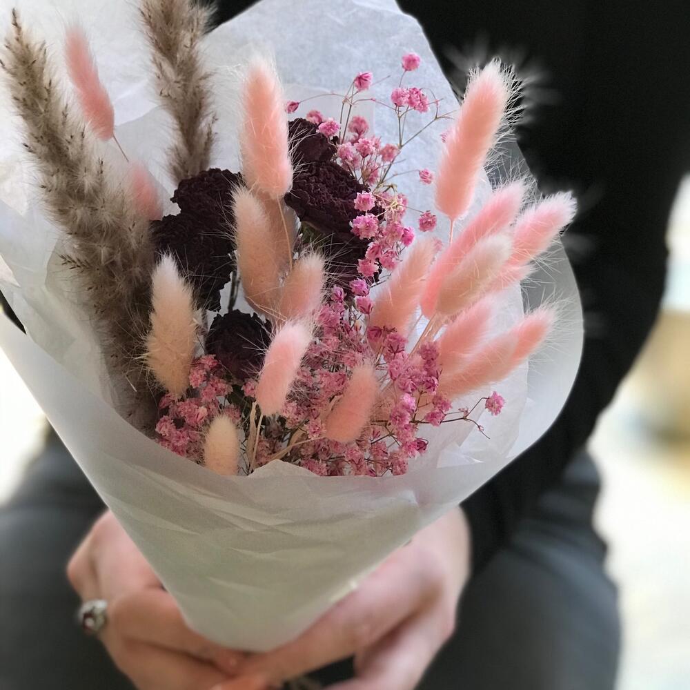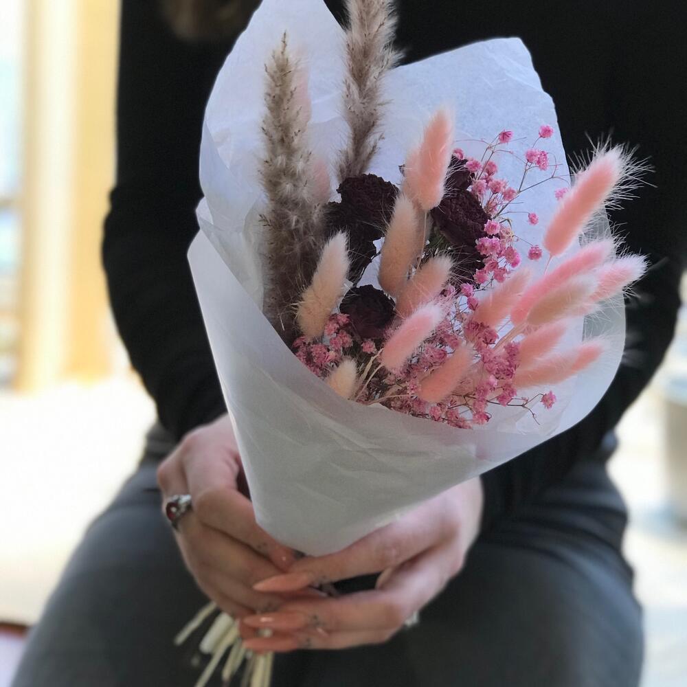 Гипсофила – 1 шт.Роза кустовая – 1 шт.Упаковка дизайнерская – 2 шт.камыш сухоцвет – 2 шт.жгут натуральный – 1 шт.лагурус (сухоцвет)банч – 1 шт.
