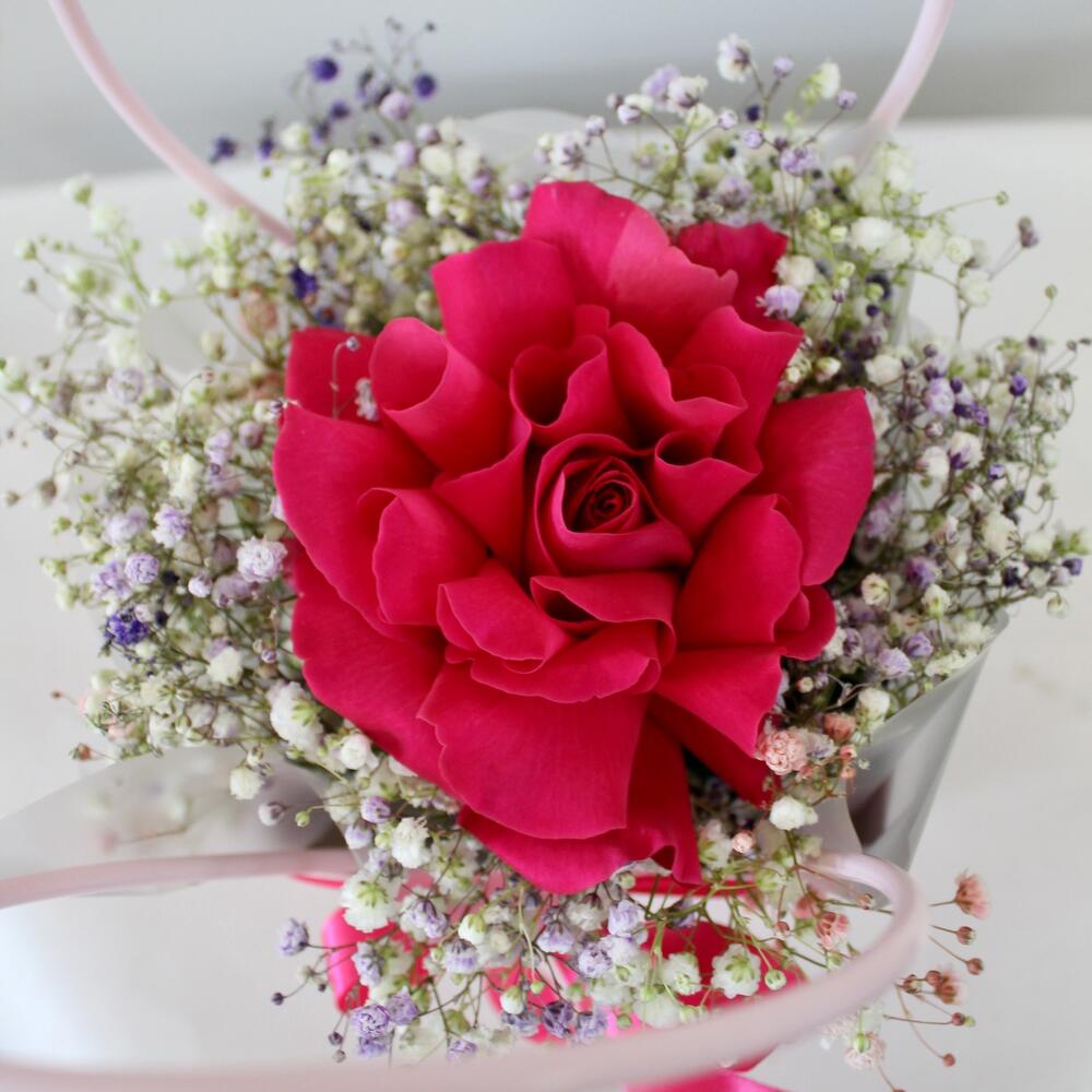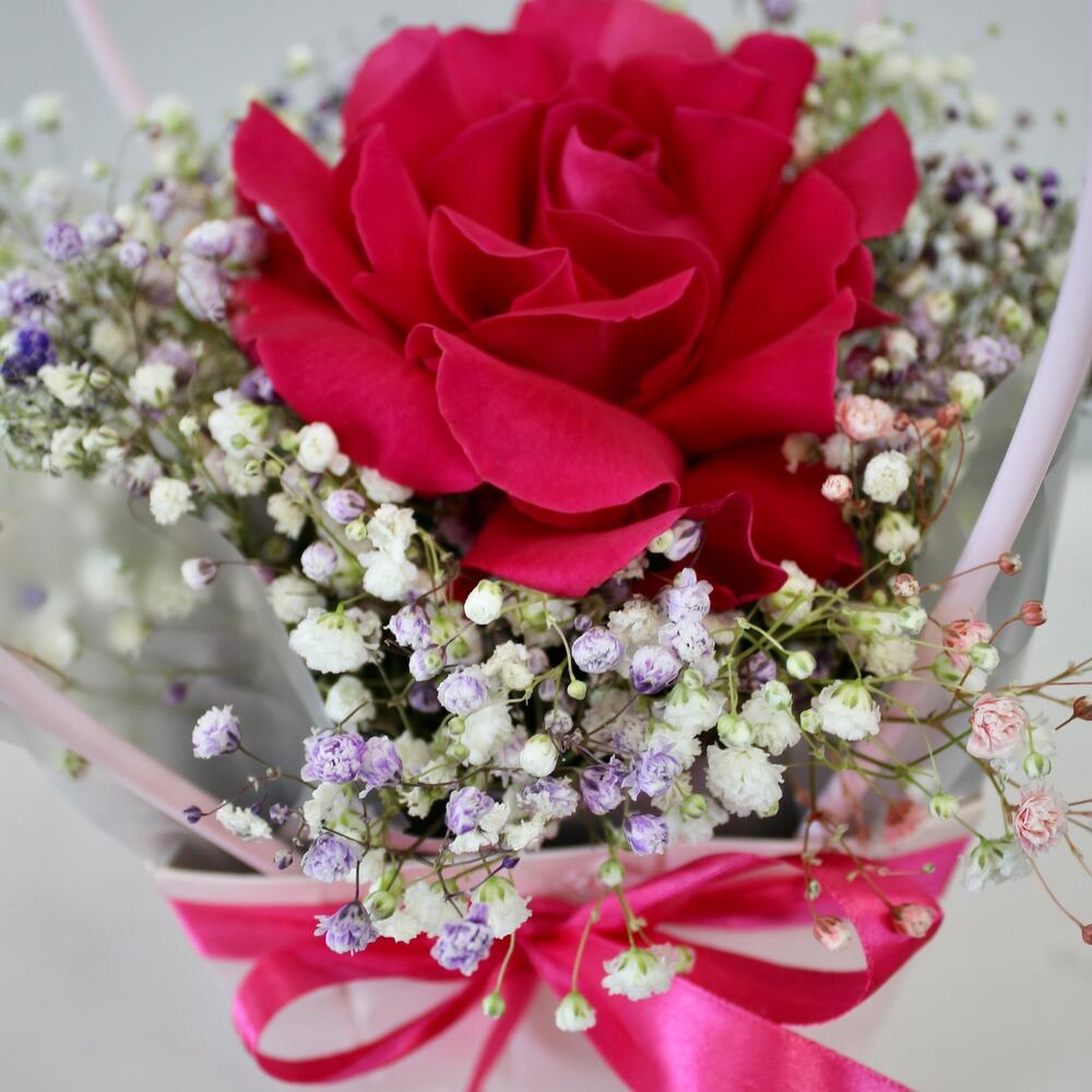 Гипсофила – 3 шт.Лента атласная – 1 шт.Сумочка – 1 шт.Роза французская – 1 шт.