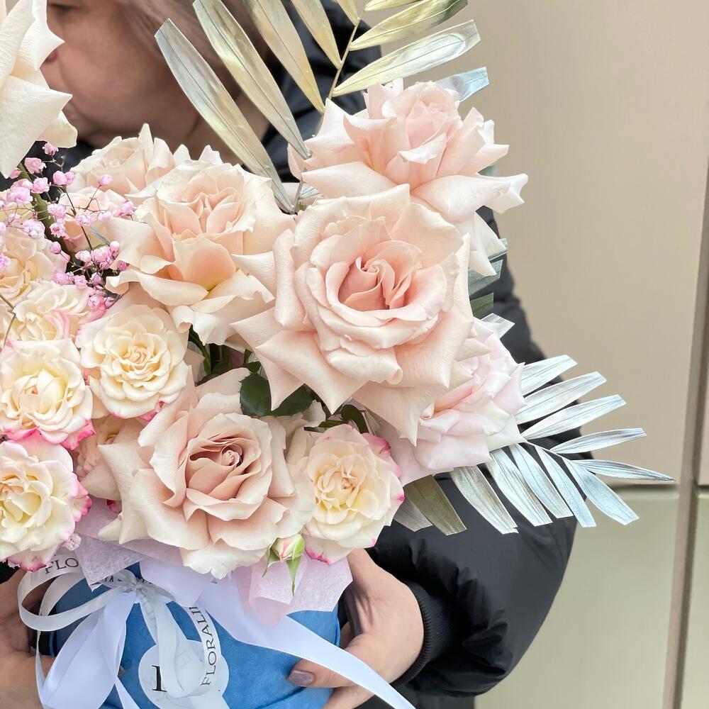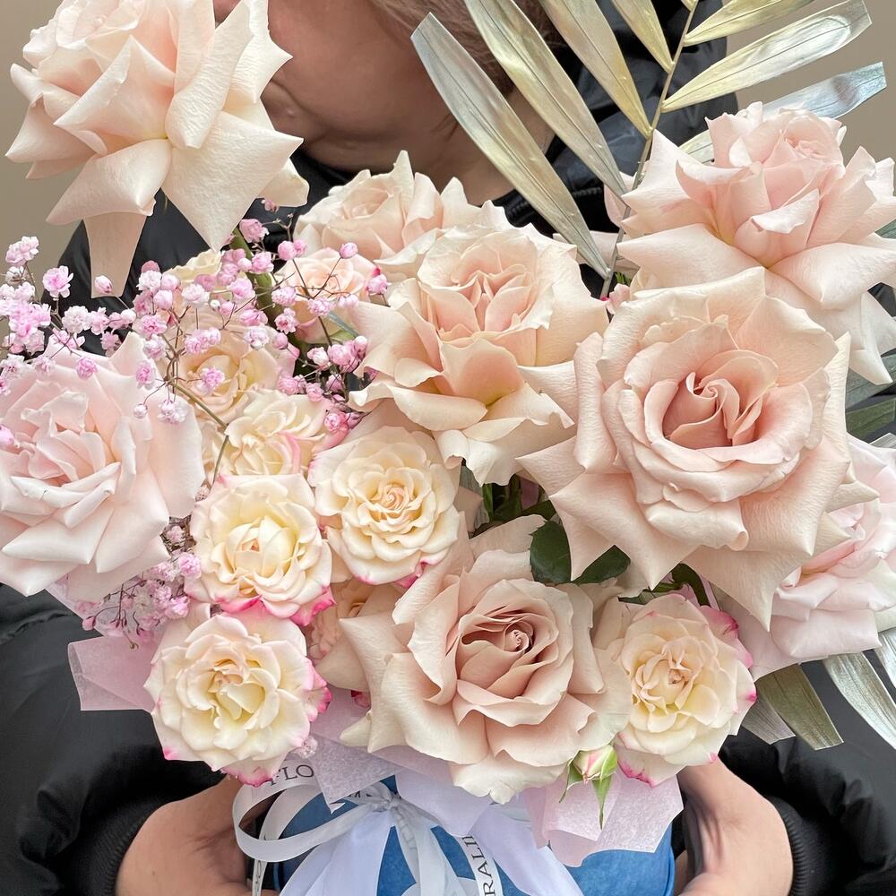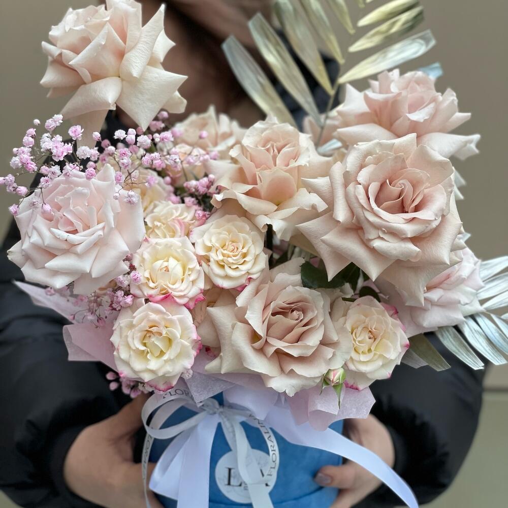 Авторская композиция в шляпной коробке с кустовыми и французскими одноголовыми розами