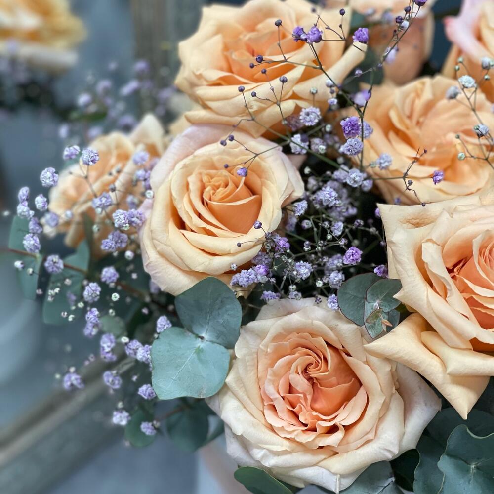 Гипсофила – 1 шт.Эвкалипт – 1 шт.Роза одноголовая – 15 шт.Коробка шляпная – 1 шт.Оазис флористический – 1 шт.