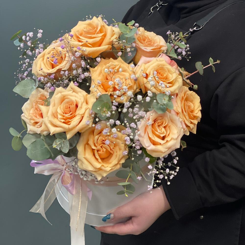 Композиция в шляпной коробке с персиковыми розами