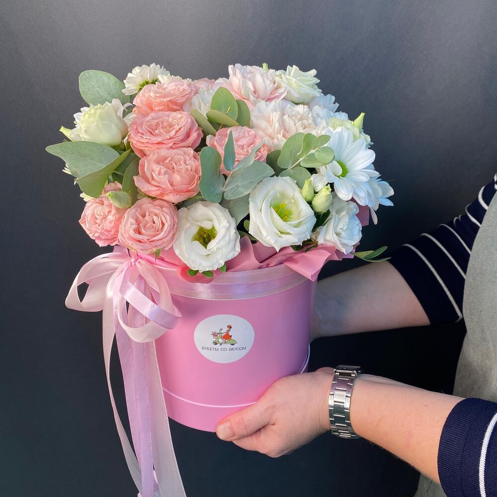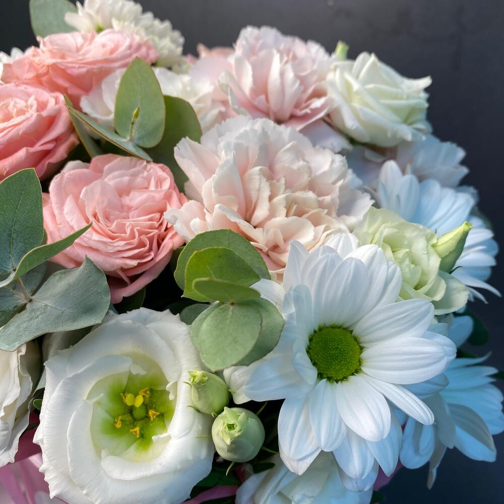 Лизиантус – 1 шт.Хризантема кустовая – 1 шт.Эвкалипт – 1 шт.Лента атласная – 2 шт.Диантус – 3 шт.Сантини – 1 шт.Роза кустовая пионовидная – 2 шт.фисташка зелень – 1 шт.шляпная коробка с губкой – 1 шт.