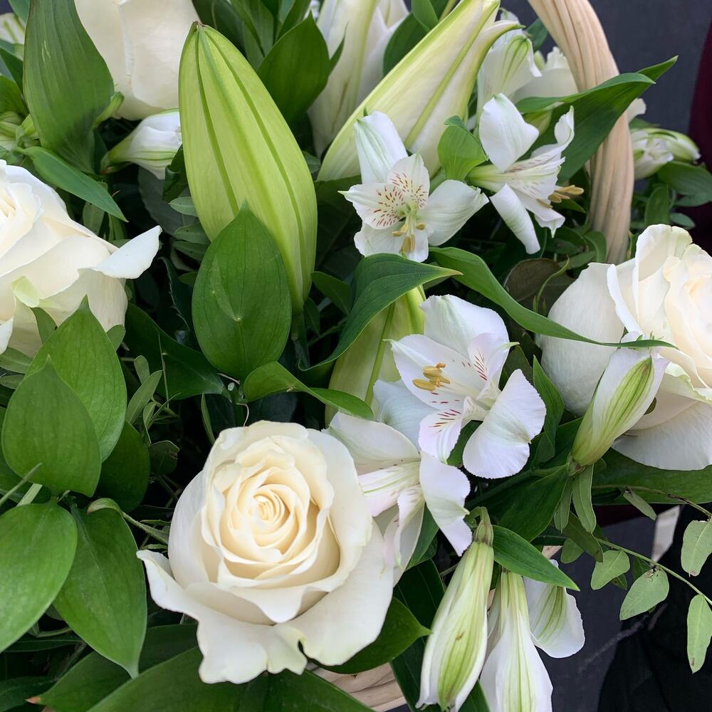 Корзина с белыми розами, лилиями и альстромериями «Весенний сад»