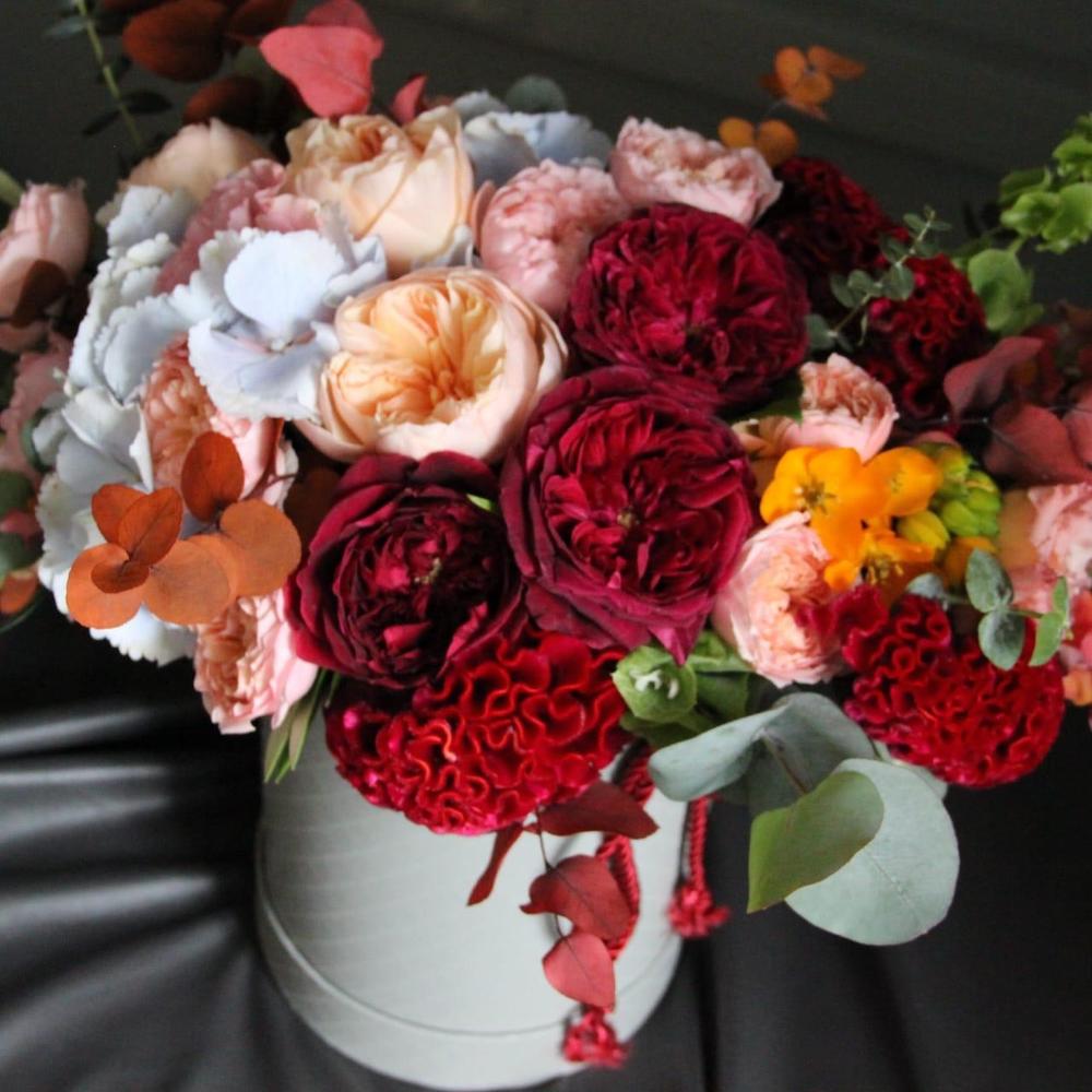 Целозия – 3 шт.Пионовидная роза – 9 шт.Кустовая пионовидная роза – 3 шт.Гортензия – 1 шт.Орнитогалум – 2 шт.Львиный зев – 2 шт.Диантус – 3 шт.Эвкалипт – 5 шт.Шляпная коробка – 1 шт.шнур декоративный – 1 шт.Оазис флористический – 1 шт.