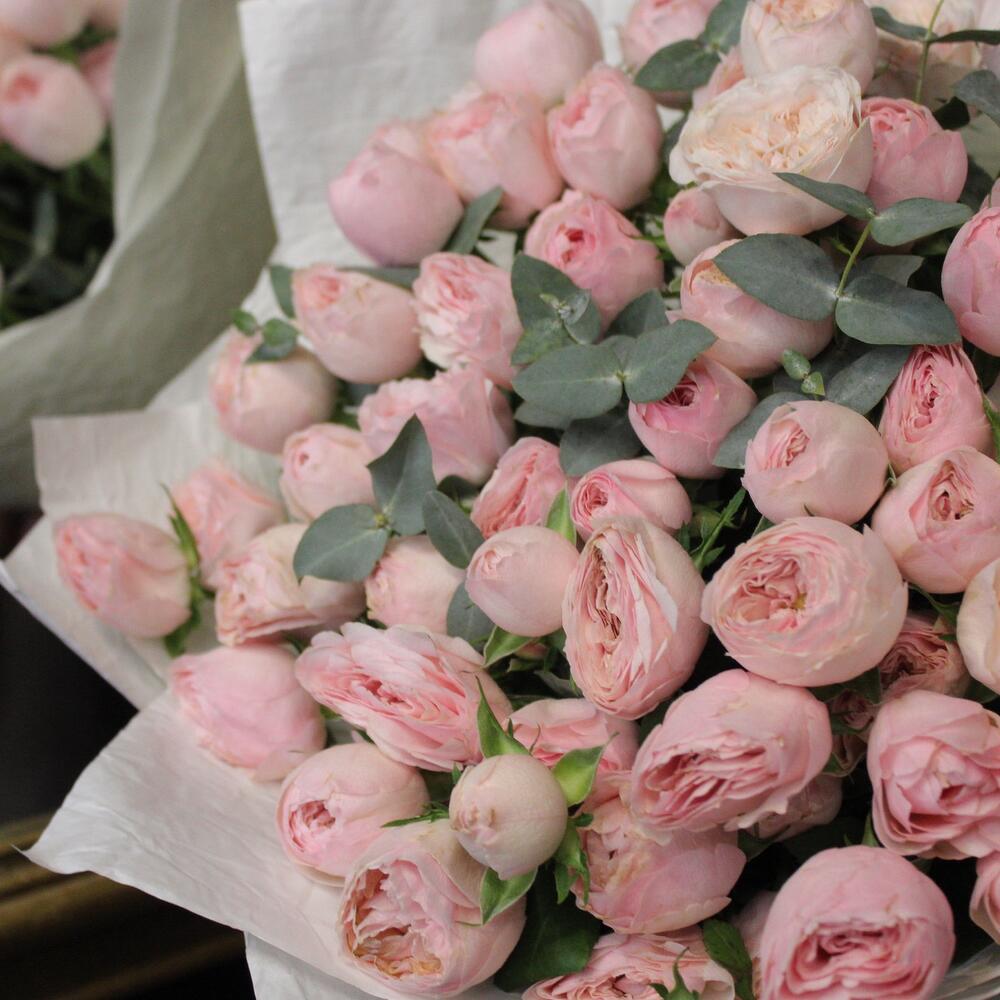 Роза кустовая пионовидная – 15 шт.Эвкалипт – 3 шт.жгкрафт упаковками – 13 шт.Лента атласная – 2 шт.