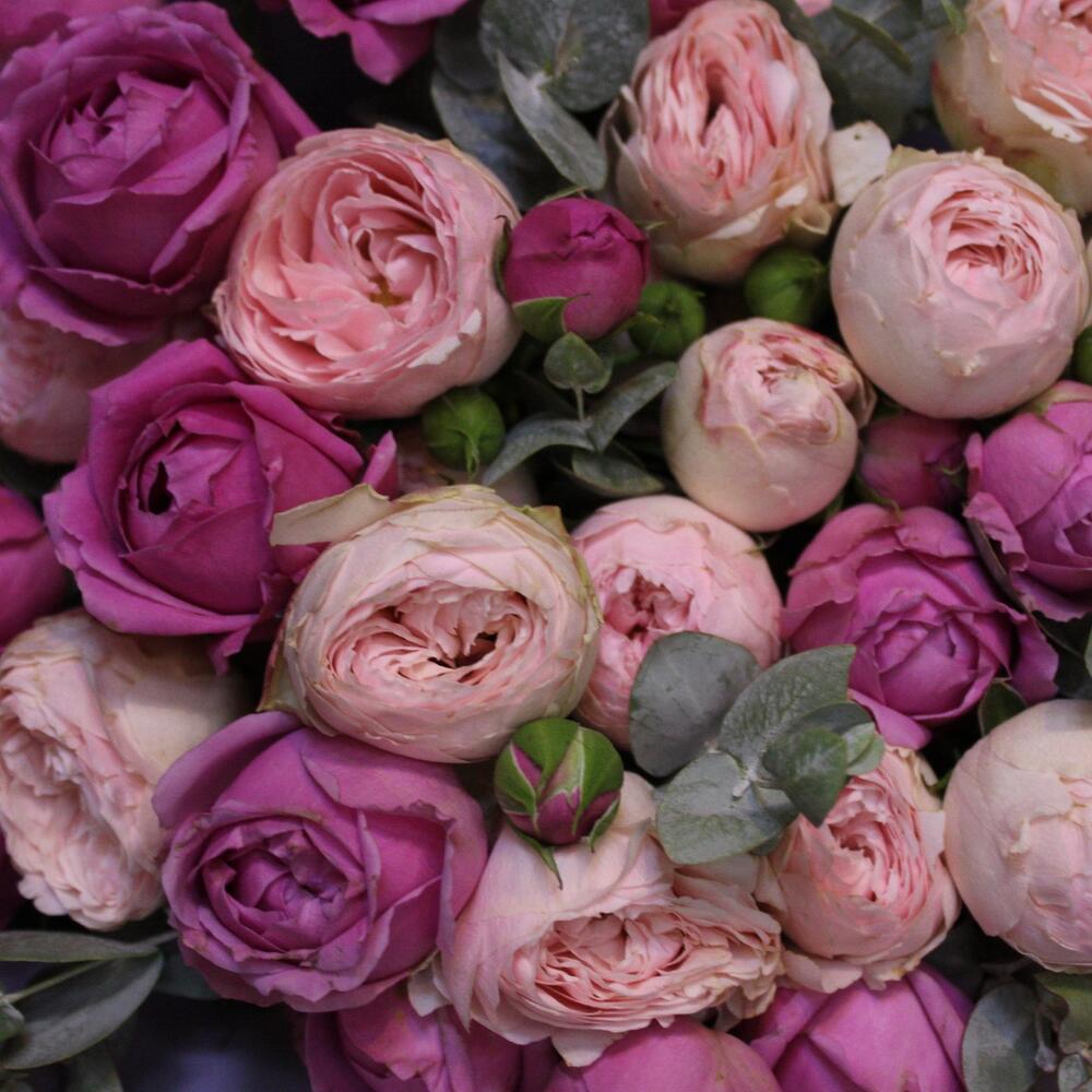 Эвкалипт – 2 шт.Пленка дизайнерская – 1 шт.роза кустовая пионовидная мансфилд парк – 5 шт.роза кустовая пионовидная мисти бабл – 4 шт.