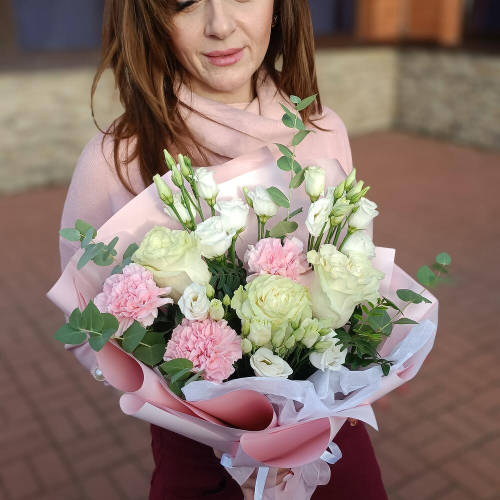 Гвоздики, Лизиантусы, Розы, Тюльпаны