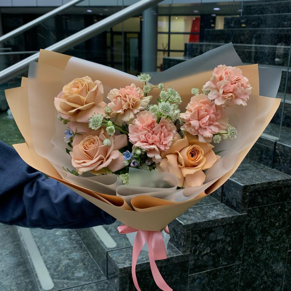 Роза Капучино – 3 шт.Диантус карамельный – 4 шт.Озотамнус – 2 шт.Оксипеталум – 2 шт.Упаковка дизайнерская – 1 шт.